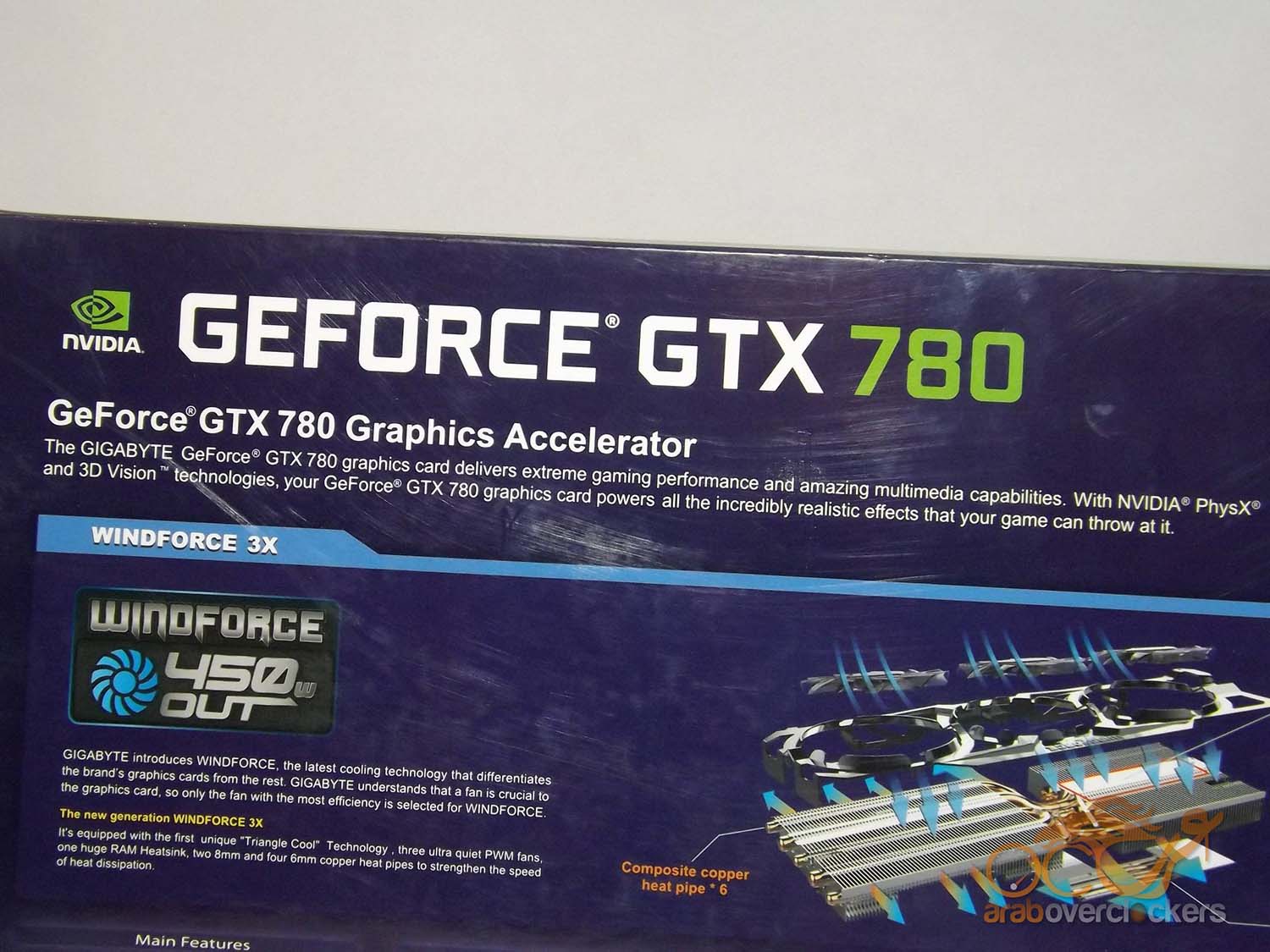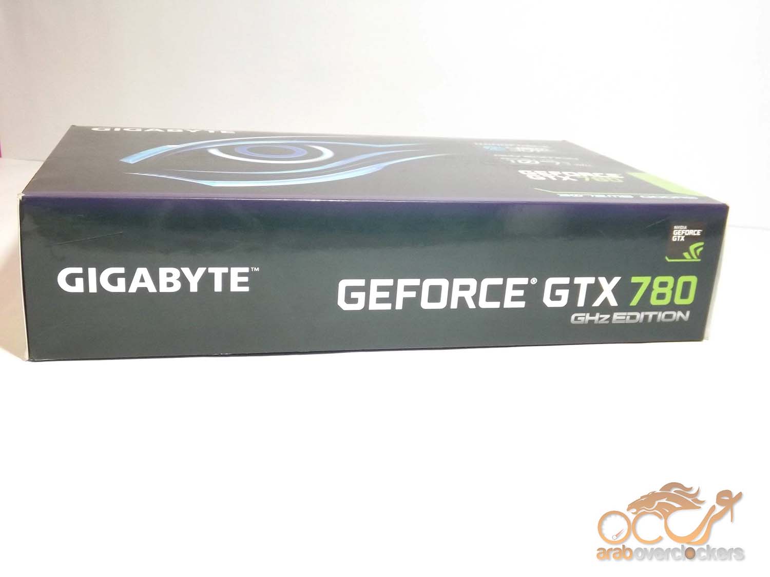 تصميم العلبة الخاص بشركة جيجابايت المعتاد وصورة العين (عين صقر أعتقد) بالواجهه واالون الأخضر اللون الرسمي لبطاقات Nvidia وهو التصميم ذاته ببطاقة GTX 780Ti السابق مراجعتها.