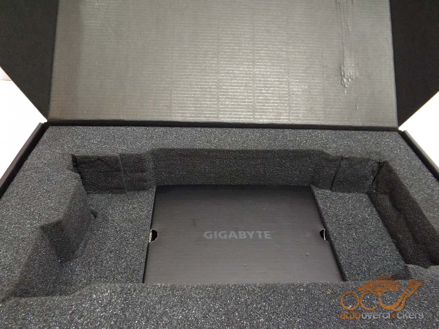 برفع البطاقة نجد باب صغير اسفلها مدون عليها Gigabyte.