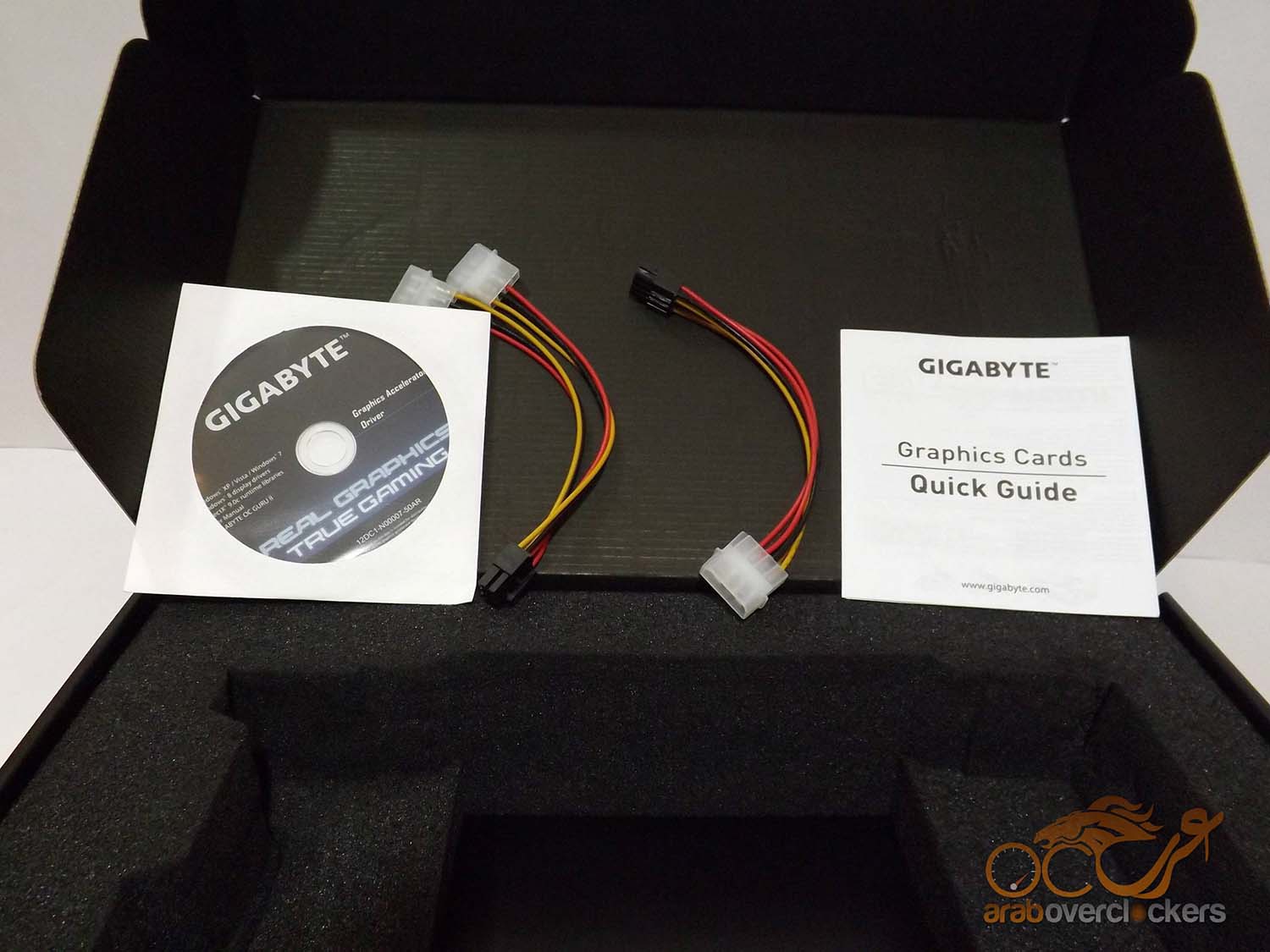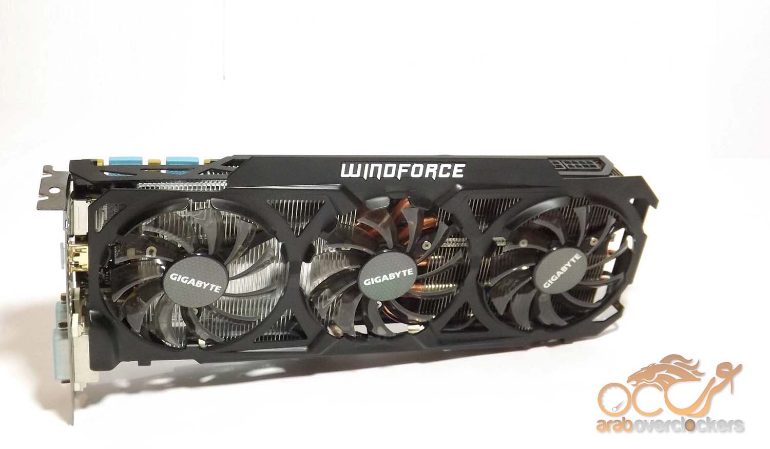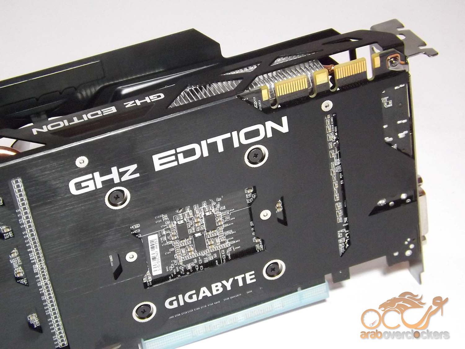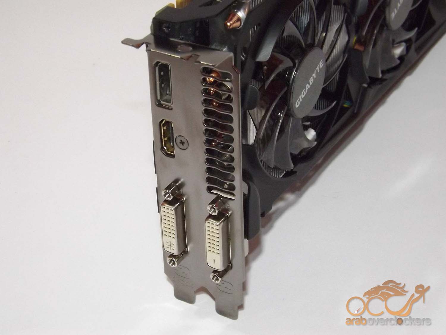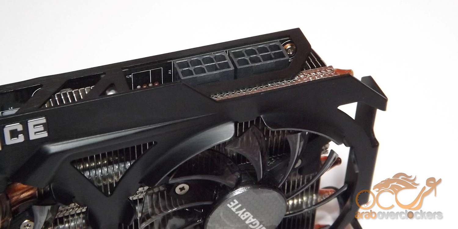 النسخ القياسية من البطاقة تأتي بمنفذين 6pin و 8pin, ولكن ولاننا بصدد التعامل مع نسخة مكسورة السرعة ونسخة إحترافيه من البطاقة فنجد أن Gigabyte قد استبدلت منفذ ال6pin بأخر 8pin.
