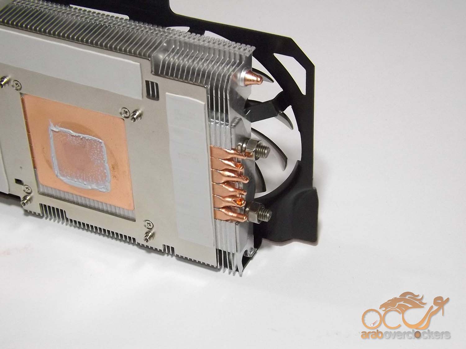ونري هنا ال6 انابيب الحرارية وأحدهم يخرج من قطعة توصيل المشتت بالمعالج الرسومي ويعود إليه مره أخري.