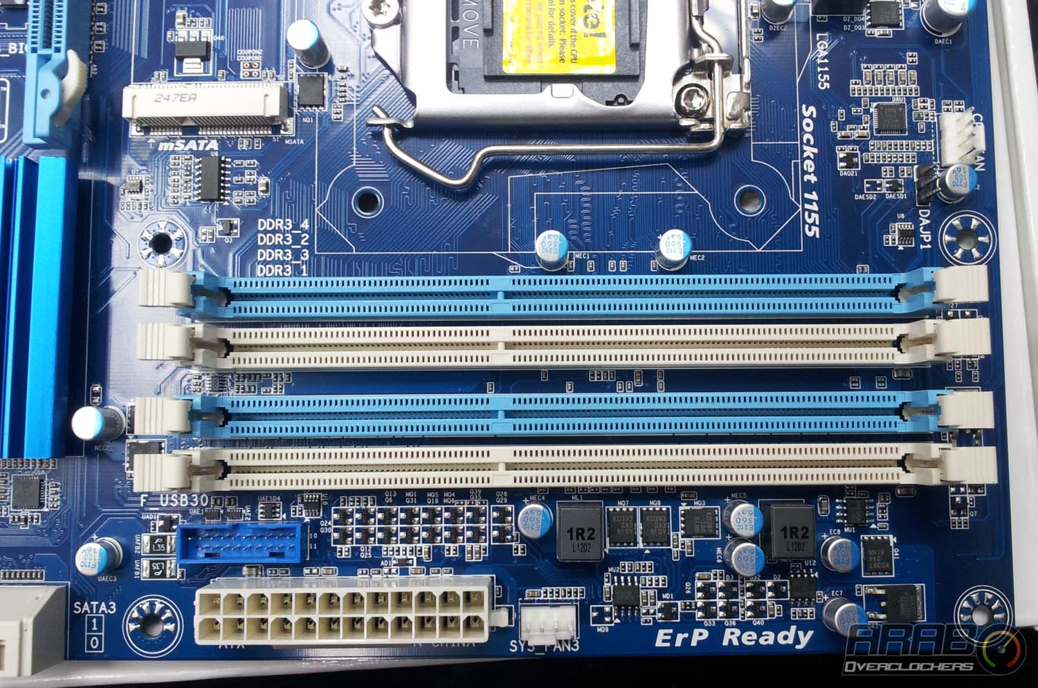 كما نرى فهناك اربعة شقوق مخصصة لتركيب الذواكر من نوع DDR3 ، تدعم خاصية Dual Channel (كما في الجيل الاقدم) ولكن هذه المرة تأتي بدعم تركيب شرائح ذاكرة بمجموع 64 جيجا لكل الشقوق . تأتي الشقوق باللونين (الابيض الازرق) للتسهيل على المستخدم حيت تركيب اطقم الذاكرة . واسفل شقوق الذواكر دائرة طاقة كاملة لامداد الذواكر بالطاقة ومساعدة المستخدم بالوصول بها الى اعلى ترددات تسمح بها الذواكر دون ان يكون هناك نقص في الامداد بالطاقة .