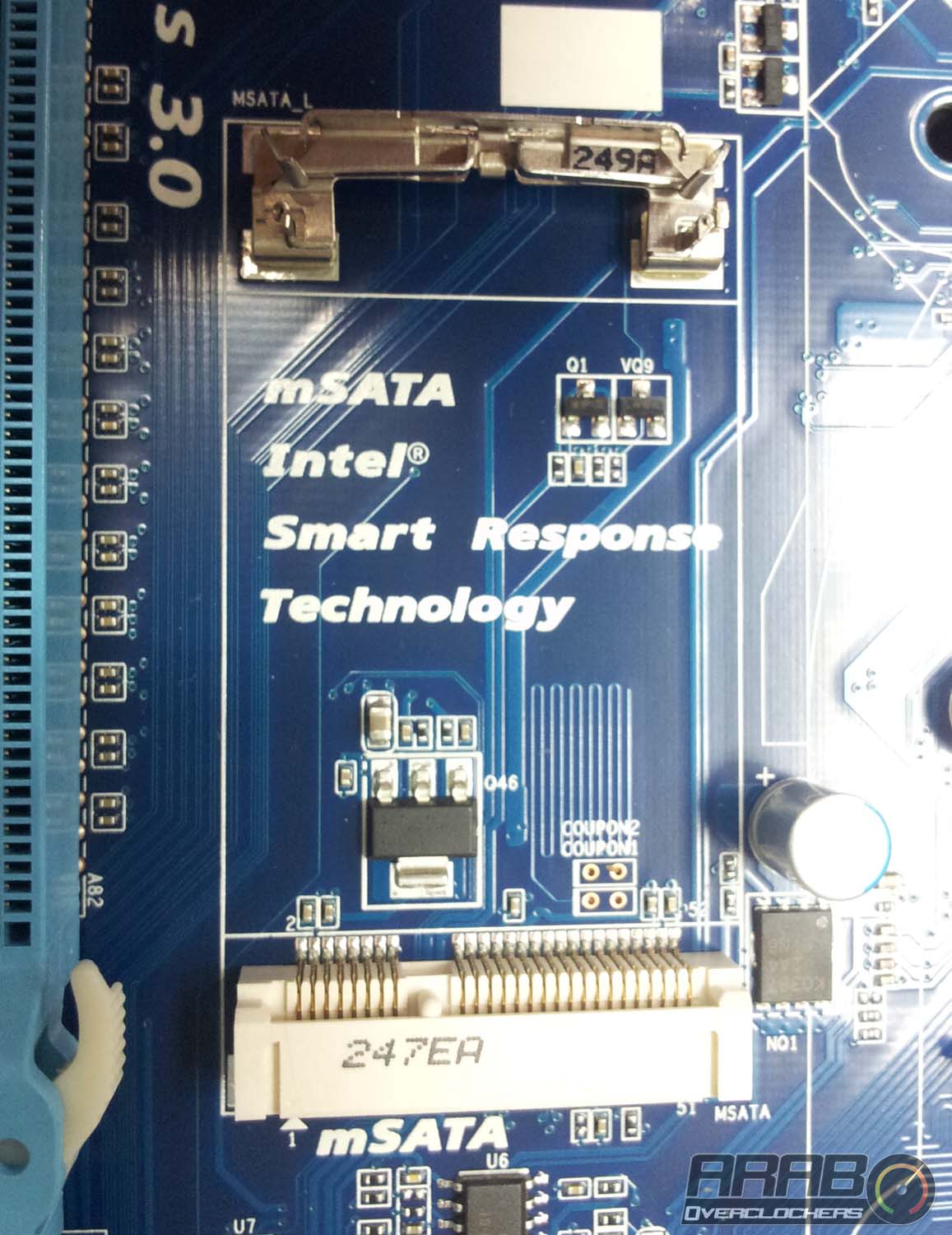 هذا هو شقة mSATA الذي ذكرناه سابقا، ويمكن للمستخدم تركيب اقراص SSD الصغيرة، ويدعم المقبس تقنيات Intel Smart Response و Intel Rapid Start ، وحين تركيب قرص SSD على المقبس يتم تعزيز وتسريع اداء اللوحة، وسوف يلاحظ المستخدم ذلك في سرعة تشغيل الجهاز وسرعة تنفيذ الاوامر عند عمل النظام .