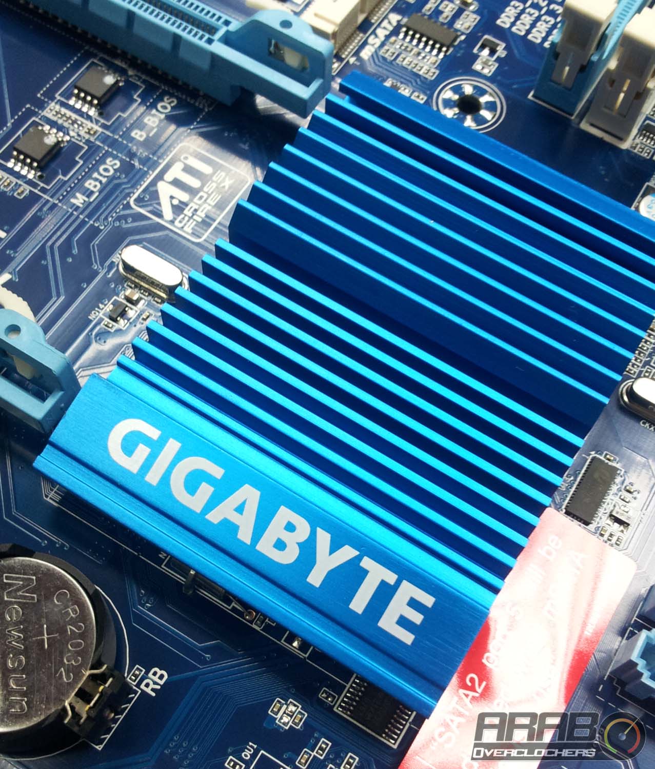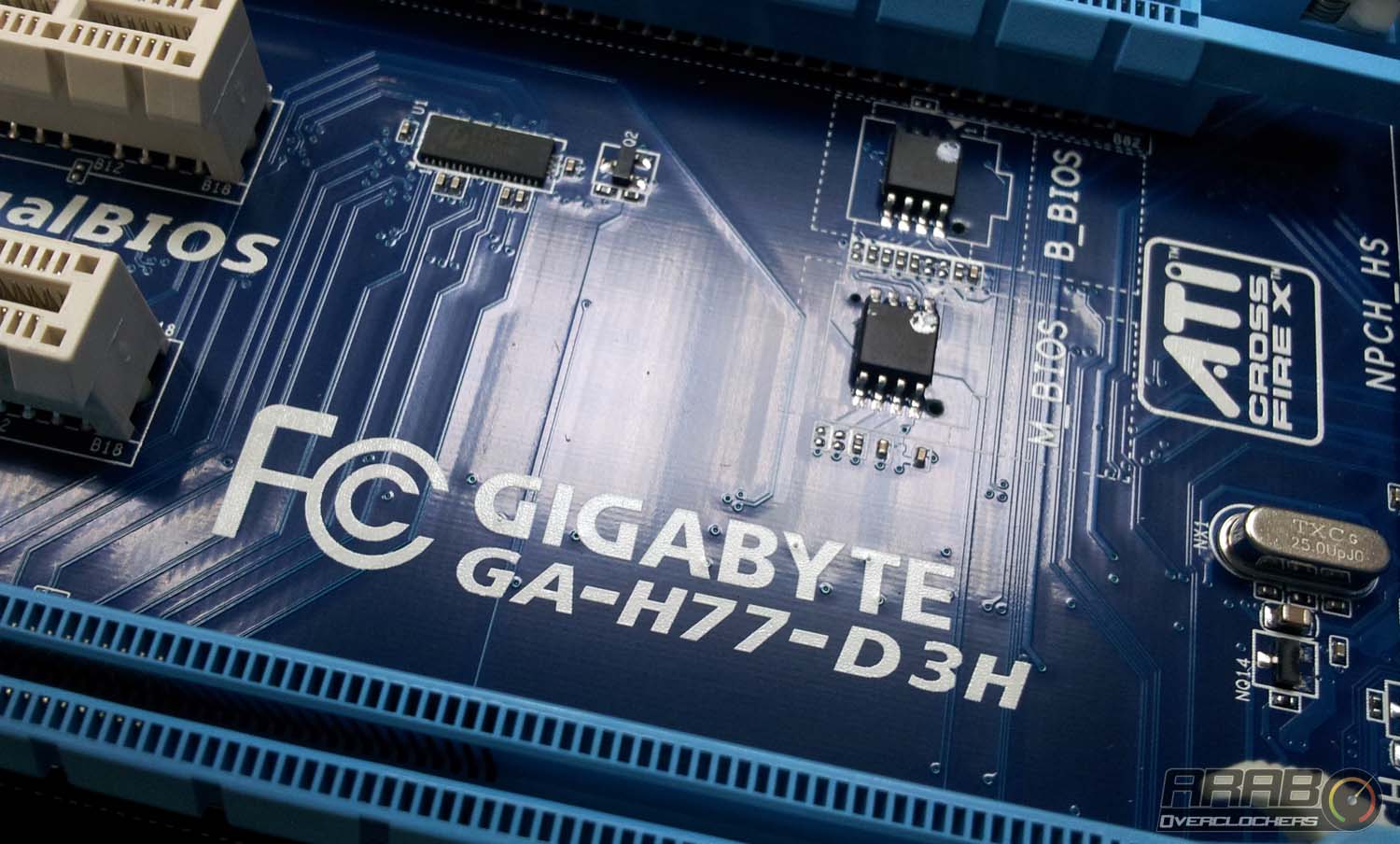 اسم الشركة وموديل اللوحة مطبوع عليها Gigabyte H77-D3H، ومن ابرز المميزات والخواص لهذه اللوحة دعمها لتقنية CrossFire X الخاصة بتعدد بطاقات AMD فقلما نجد لوحة متوسطة بهذا السعر تحتوي على هذه الميزة .