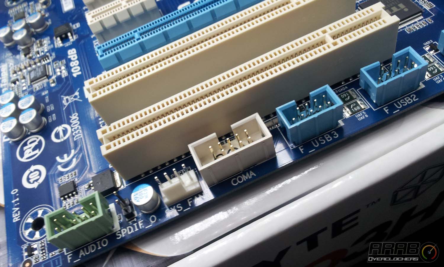 اسفل اللوحة نجد مجموعة كاملة من اسنان (ابر) التوصيل ، فهناك مقبس لتوصيل مقابس الصوت الامامية للصندوق مع مقبس SPDIF للصوت الرقمي ، وثلاث مقابس USB 2.0 (ست منافذ) ومقبس منفذ تسلسلي من نوع COM لتوصيل ملحق خارجي ايضا كمبرمجة الكامات وما شابهها . والمنافذ باللون الابيض على الجانب خاصة بتوصيل كابلات صندوق الحاسب (للتشغيل اعادة التشغيل وايضا انوار الحالة ).