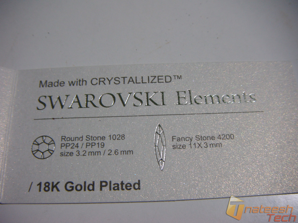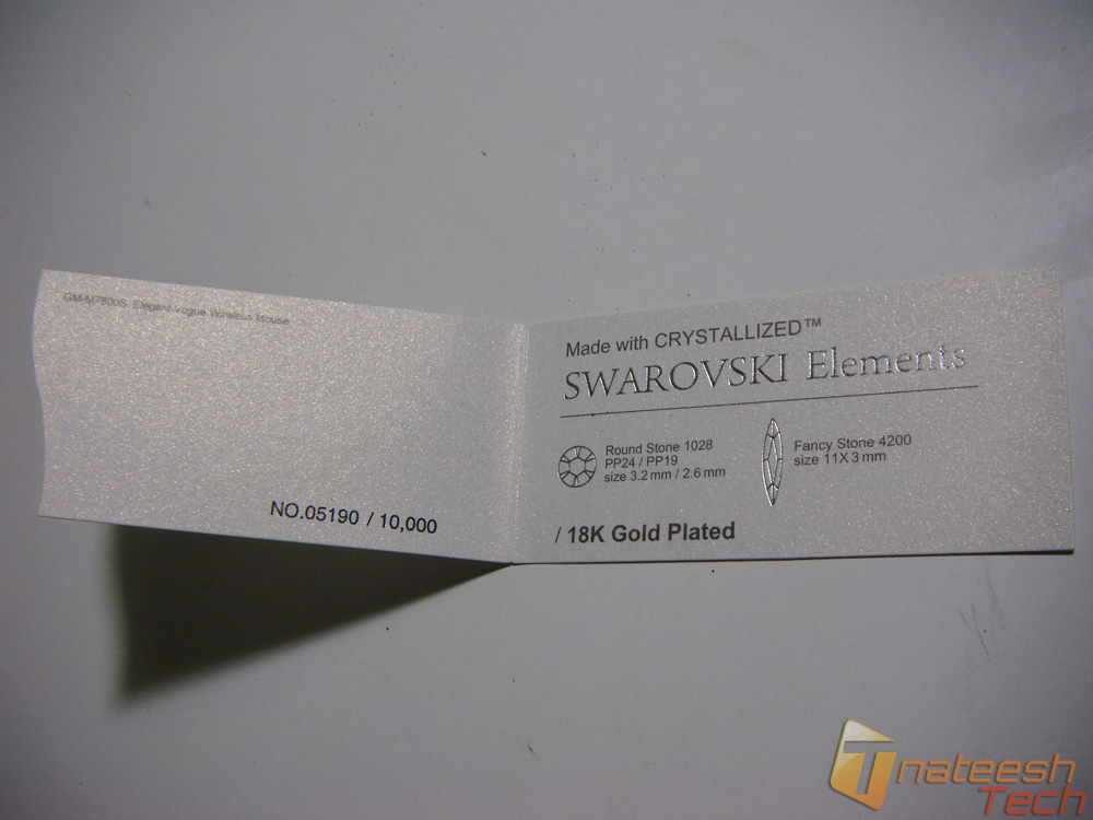 فقد تم تطعيم الفأرة (كما ذكرنا من قبل) باربعة فصوص من الكريستال النقي من شركة شهيرة وعريقة في هذا المجال الا وهي Swarovski Elements وهي شركة يلمع ويشتهر اسمها في عالم الموضة ، وقد ارفقت Gigabyte كارت انيق يحتوي على تفاصيل هذه الفصوص واوزانها واحجامها التفصيلية (لكي تشعر بالتميز حين شرائك لهذه الفأرة) .