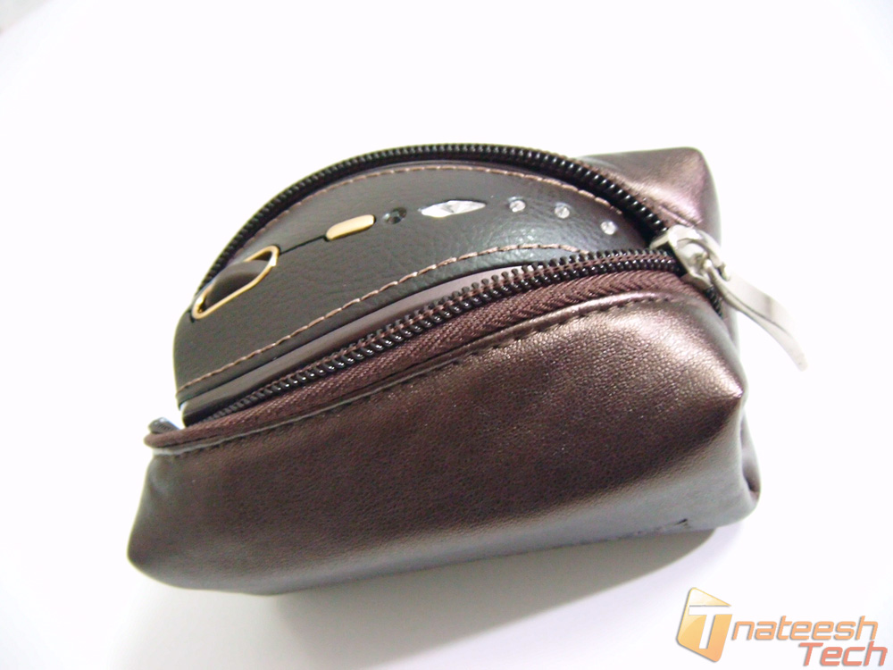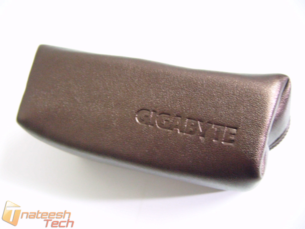 لان هذه التحفة الفريدة (الفأرة) تستحق العناية فقد قامت الشركة بارفاق حافظة جلدية فخمة مبطنة جيدا لوضع الفأرة بها والحفاظ عليها في حالة عدم الاستخدام . نجد على الحافظة اسم جيجابايت Gigabyte محفور عليها (حتى لا تنسى ان هذه التحفة من الشركة) .