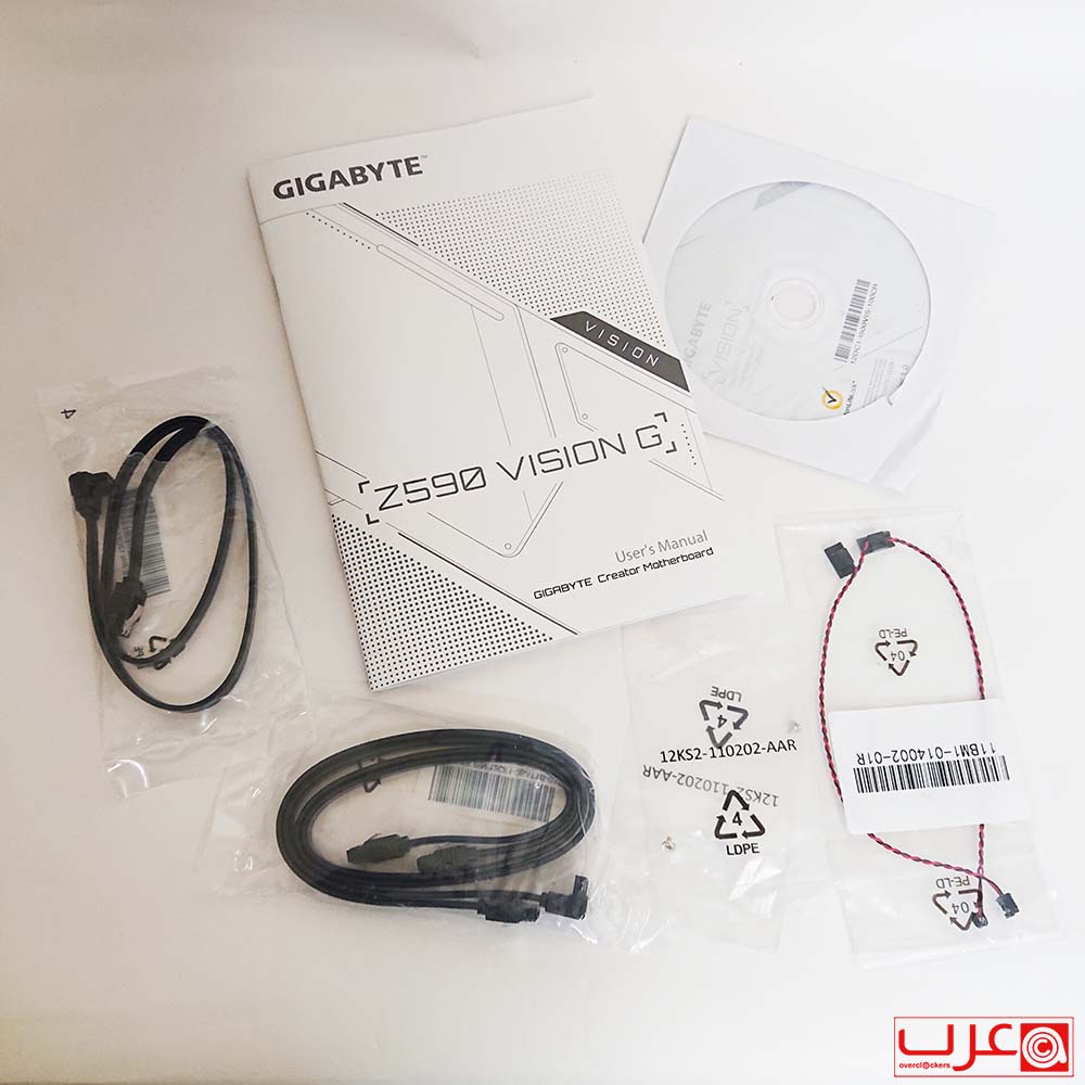 يتميز الجزء الأمامي من صندوق Gigabyte Z590 Vision G بخلفية بيضاء مع نمط ذهبي. تتم طباعة “Z590 Vision G” باللون الأبيض، مع وضع شارة العلامة التجارية على اليمين.