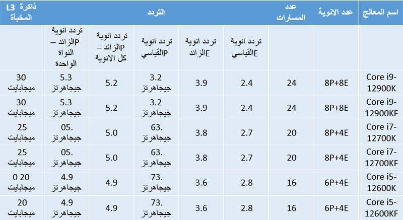 سنحاول في السطور التالية القاء الضوء بشكل مبسط على معمارية Alder Lake الجديدة، وتقديم معالجها الاعلى Core i9-12900K الذي يحتوي على 16 نواة و 24 مسار. 8 انوية P (16مسارا) و 8 انوية E (8 مسارات). ويحتوي هذا المعالج على 30 ميجابايت من ذاكرة التخزين المؤقت L3، وتوزيعها كالتالي، 3 ميجابايت لكل نواة من انوية (Golden Cove) و 3 ميجابايت لكل مجموعة انوية (Gracemont). مما يعني 24 ميجابايت لانوية P و 6 ميجابايت لانوية E. وتحتوي الشريحة على 14 ميجابايت من ذاكرة التخزين المؤقت L2.