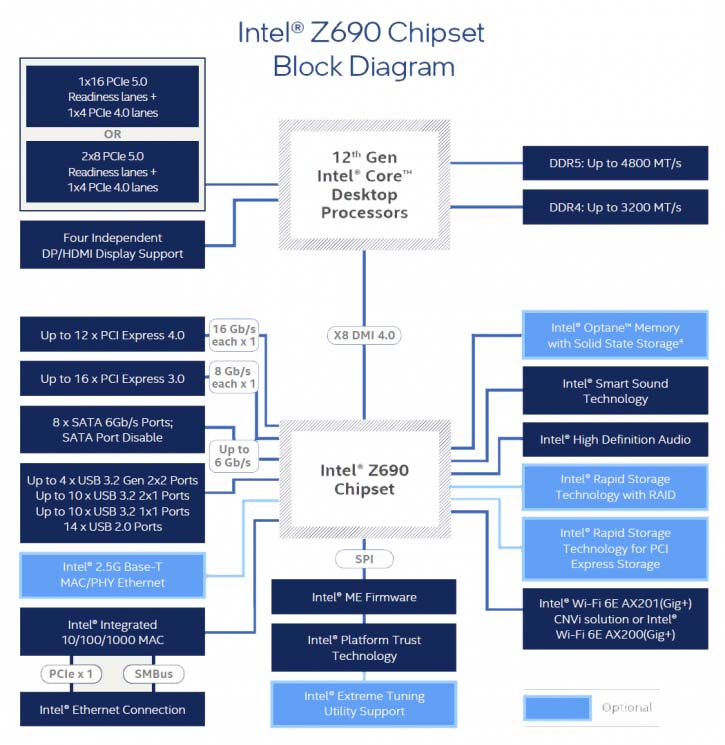 المثير للاهتمام هو الرسم التخطيطي لشريحة Z690، وهو الطراز الأعلى لشرائح Intel 600 الذي تم إصداره أولاً. تحتوي وحدة المعالجة المركزية على 16 ممر (أو مجموعتان من 8 ممرات PCIe 5.0)، والتي يمكن استخدامها للرسومات أو التخزين، بالإضافة إلى أربعة ممرات لواجهة NVME 4.0. ويبدو أن كل ما قيل سابقاً صحيح؛ وتحتوي الشرائح على 12 ضعف مقارنة بـ gen4 و 16 ضعف مقارنة بـ gen3. تشمل الميزات الإضافية دعمًا لوحدتي DIMM لكل قناة ذاكرة وذاكرة DDR4-3200 ثنائية القناة أو DDR5-4800 مع وحدتي DIMM لكل قناة ذاكرة.