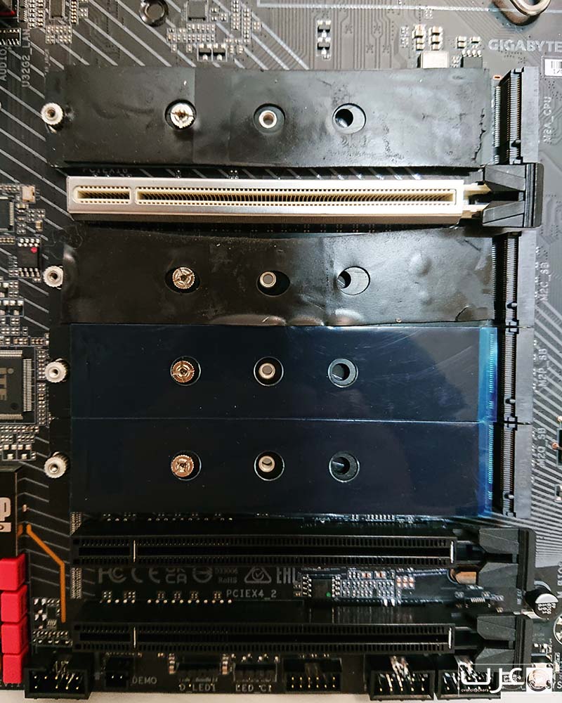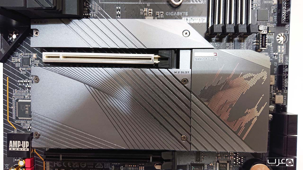 ففي مكان فتحات توسعة PCI Express المعتادة، ستجد ما مجموعه أربعة مآخذ M.2 تدعم جميعها PCI Express 4.0 ويتم تبريدها بواسطة حل تبريد متكامل. تستخدم الفتحة العلوية عرض النطاق الترددي من المعالج بينما تستخدم الفتحات الأخرى مباشرة مع SB / MCP. ولا يهم الفتحة التي تختارها إلا إذا كنت تقوم بتشغيل مزيج من محركات الأقراص القائمة على M.2 و SATA.