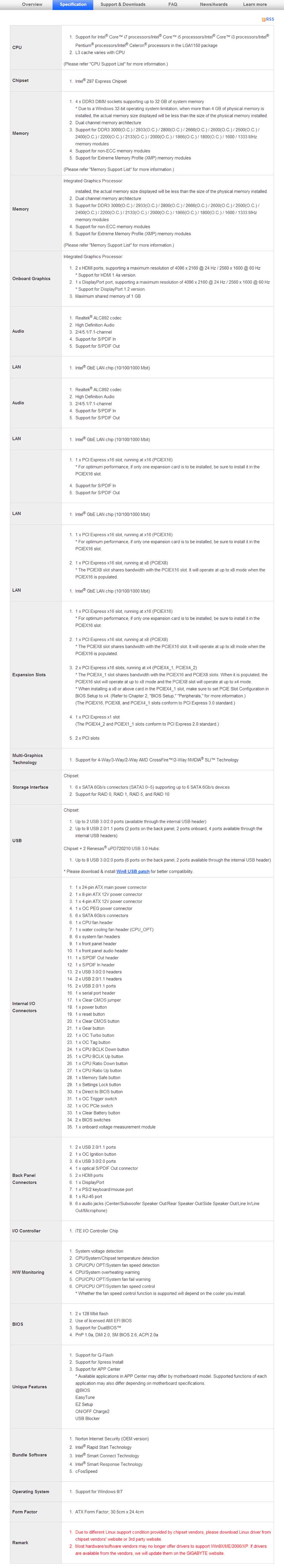 مجملاً فاللوحة تأتي بمقبس 1150 ألداعم لكل معالجات الجيل الرابع جيل Haswell, تحوي شريحة Z87 أقوي شريحة لهذا الجيل من المعالجات لتدعم الذواكر وحتي حجم 32جيجابايت وبتردد أقصاه 3000MHz. يمكنها الأستنفادة من حلول Intel الرسومية المدمجة بالمعالج من خلال منفذي HDMI ومنفذ DisplayPort 1.2 وبهذا تكون قادرة علي التعامل مع حتي دقة 4K.