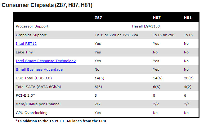 سنتعرض فقط لشريحة Z87 والتي تعتبر هي أعلي فئة وأكثرهم مميزات والجداول التالية تشرح الأمر بإختصار شديد.
