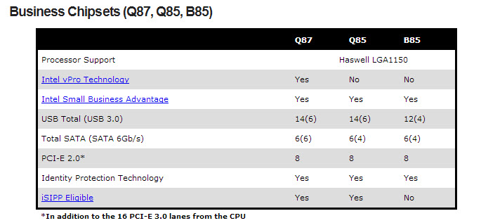 شرائح اللوحات الأم الداعمة لمعالجات الجيل الرابع من Haswell الرئيسية هي Z87 و H87 و H81 للمستهلكين ثم تأتي شرائح أخري موجهة للأعمال أو Business Grade وهي Q87 و Q85 و B85.