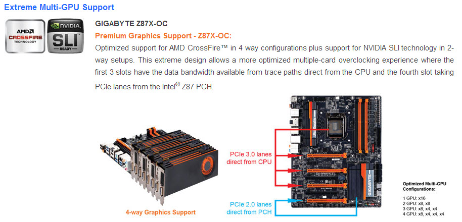 اما بخصوص شقوق التوسعة فاللوحة هنا تدعم حتي توصيل 4 بطاقات من AMD بتقنية CFX أما بالنسبة لبطاقات Nvidia سيكون الحد الأقصي هو 2Way SLI فقط ويأتي هذا بدعم مباشر من المعالج الحسابي للجيل الرابع من Intel فهو قادم ليوفر منفذ x16 من الشق الأحدث 3.0 PCIe والذي يمكن تقسيمه ولحتي 3 شقوق 3.0 PCIe فحين يتم استخدم الأول فقط فهو يعمل كـPCIe x16 وحال تم الأنتقال ل2way SLI أو CFX سيعمل الشق الأول بسرعة x8 والثاني x8 ايضاً. أما حال تم شغل الثلاث شقوق سيكون ترتيب سرعة الشقوق هو x8+x4+x4. اما الشق الرابع فيأتي من شريحة Z87.