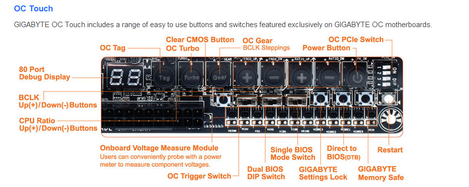 OC Touch هي لوحة التحكم كاسري السرعة والتي تعد تماماً كلوحة تحكم الطيار أو سائق سيارات التسابق والتي منها يمكنه التحكم بل ومتابعة كل تفصيلة خاصة باللوحة الأم بكل ما يقبع عليها من مكونات, فمنها يمكنه تعديل التردد المرجعي BCLK زيادة ونقصاناً, كذلك معامل الضرب للمعالج CPU Ratio لمعالجات فئة K. بالطبع نجد الثلاث ازرار التي لا غني عنها في مثل هذه الفئة من اللوحات Restart, Power باللون الأبيض وكذلك زر Cear CMOS. ايضاً نجد ثلاث مفاتيح بجوار زر Restart الأبيض وبالترتيب من جهة ذلك الزر الأبيض الأول زر Memory Safe يقوم بإعادة إعدادات الذكرة للوضع الأفتراضي دون تغيير في أي اعدادات أخري, والثاني يجعل اللوحة اوتوماتيكياً تقوم بفتح الجهاز مباشره علي واجهة البايوس وذلك لأن سرعة الأجهزة الأن جعلت من الصعب اللحاق بصفحة الاختيارات التي كانت تطالب بالضغط علي زر الDel للدخول للبايوس ولهذا كان هذا الزر هاماً حتي لا يضيع وقت كاسري السرعة. اما الأخير Setting Lock نقاط قياس الفولتيه من الاضافات الرائعة والتي تفيد كاسر السرعة في مراقبة الفولتية وبشكل مباشر في كل مراحل الكسر دون الحاجة للأرتباط بأي برنامج خارجي سواء من خلال بيئة نظام التشغيل أو حتي الBios. ويتم الأمر بتوصيل اجهزة القياس المخصصة للأمر في المنفذ الذي تريد.