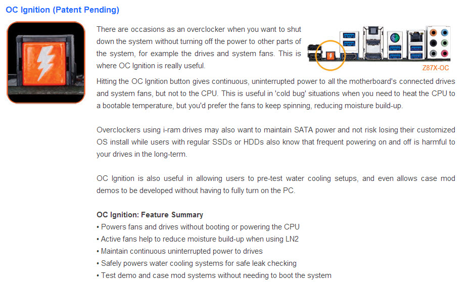 زر OC Ignition هو احد ابداعات Gigabyte والذي تنتظر الحصول علي براءة اختراعه, يأتي ليحل مشكلة كاسري السرعة التي تواجههم من جراء اغلاق وتشغيل وإعادة تشغيل الجهاز أو النظام مرات كثيره متعددة ما يؤثر سلباً علي مكونات الجهاز والنظام ككل خصوصاً التي قد تنتح من عملية الغلق المباشر نتيجة خطأ ما في عملية كسر السرعة. أيضاً للتخلص من مشكلة Cold Bug والتي يصل فيها المعالج أو مكونات الحاسب التي يتم تبريدها بالLN2 مثلاً لحالة من البرودة تمنعها حتي من الأقلاع.