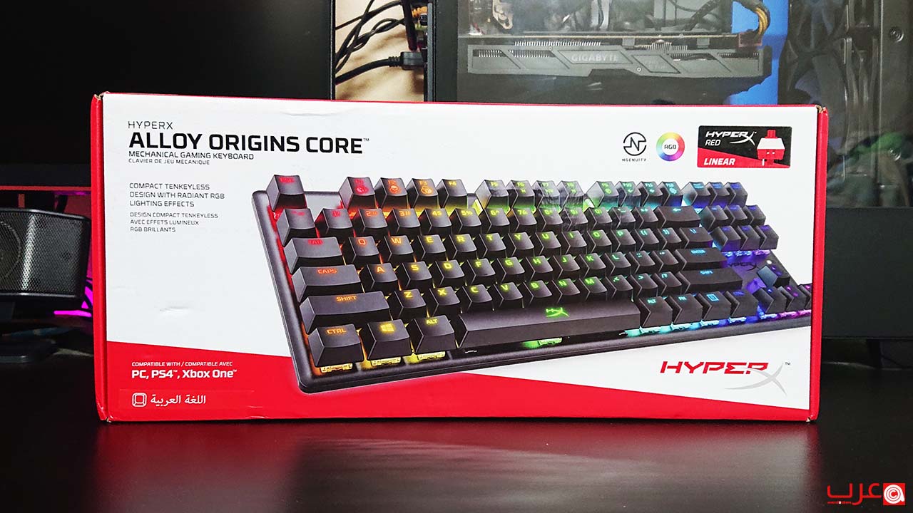 تأتي Alloy Origins Core في صندوق كرتوني طويل متين، يتميز بطابع HyperX المعتاد باللونين الأحمر والأبيض. يحتوي الجزء الأمامي من الحزمة على صورة للوحة المفاتيح، بينما يظهر اسمها في الزاوية اليسرى العليا. ويظهر HyperX في القسم الأيمن السفلي، بينما تعرض المنطقة المقابلة منصات الالعاب والاجهزة المتوافقة مع Alloy Origins Core.