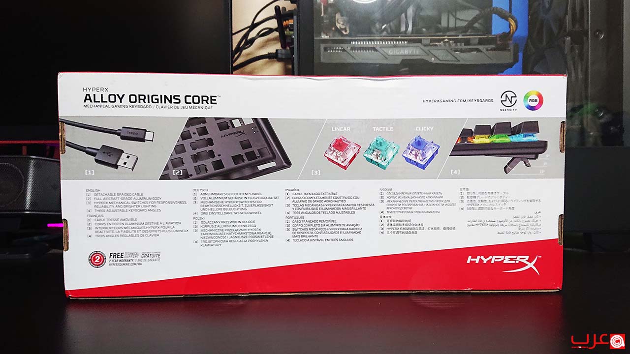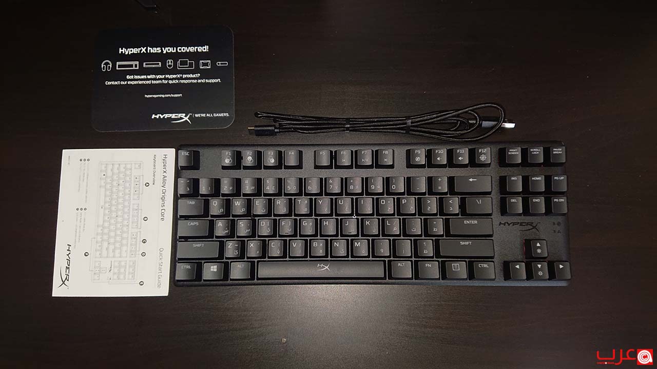عند فتح الصندوق ستجد رسالة شكر قياسية من HyperX وبطاقات الدعم ودليل البدء السريع. وبالاضافة اليهم ستجد لوحة Alloy Origins Core نفسها وكابل USB Type-C إلى A بطول 1.8 م مضفر. هذا الكابل ضروري لربط لوحة المفاتيح بجهاز الحاسب أو منصة الالعاب.