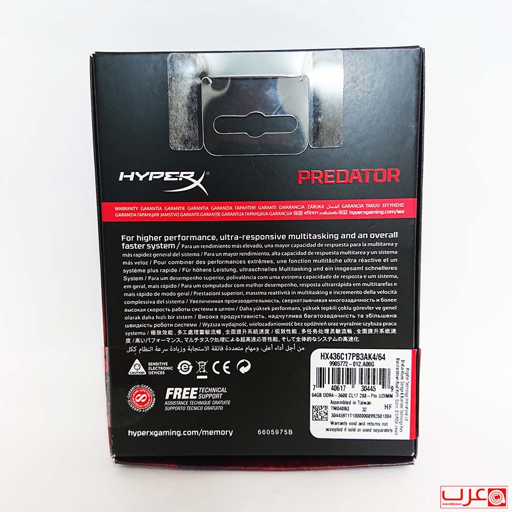 لم تغير HyperX عبوة سلسلة Predator منذ عام 2016، عبواتها الملونة بالكامل تظهر واحدة من الذواكرة تحت جزء شفاف، ونجد اسم السلسلة بالاضافة الى عدد القطع وحجم كل قطعة مع ذكر التردد، كل ذلك في مربع باللون الابيض. وهي مخصصة لإعادة تدويرها بعد تثبيت الذاكرة.