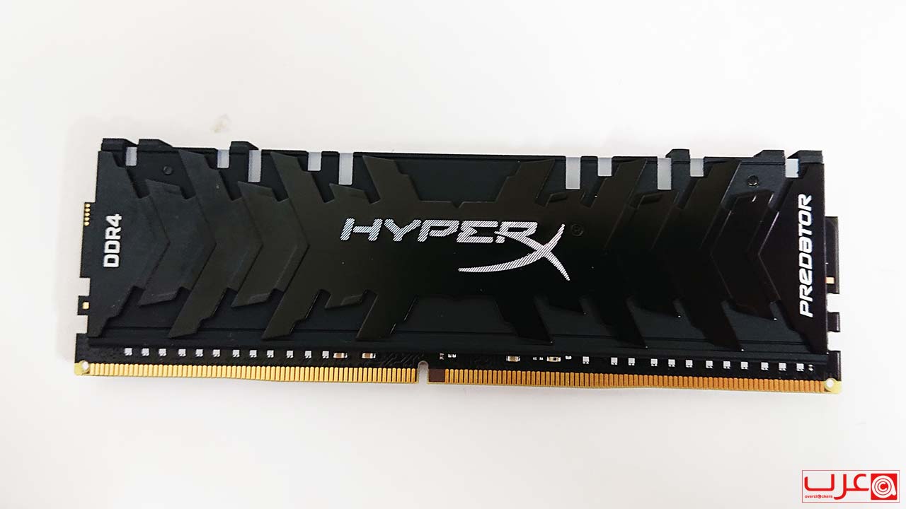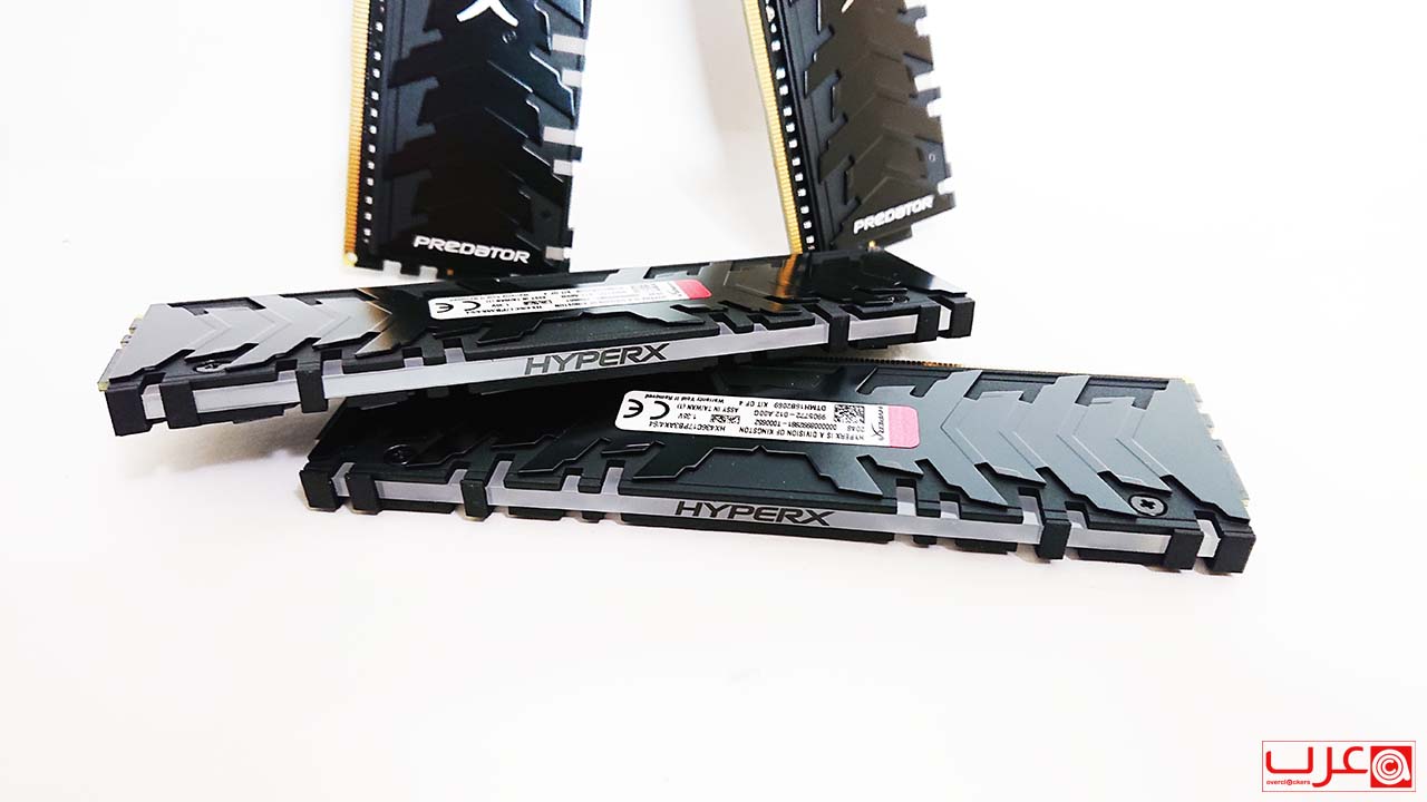 ظهرت ذاكرة HyperX Predator DDR4 RGB لأول مرة في عام 2018 ولم تتغير. إنها تتميز بمشتت حراري من الألومنيوم الأسود القوي الذي تم تصميمه لتحسين عرض ضوء RGB. تأتي الوحدات معدة مسبقًا في المصنع مع تأثير إضاءة موجة RGB. وإذا كنت ترغب في تغيير هذا، يمكنك استخدام برنامج HyperX NGENUITY المتاح للتنزيل مجانًا. في الجزء الأمامي من الوحدات، قد تلاحظ وجود ثقب صغير بالقرب من الحافة العلوية للوحدة بجوار كلمة Predator. هذا مخصص لتقنية HyperX’s Infrared Sync التي تضمن مزامنة عرض الضوء دائمًا بشكل صحيح.