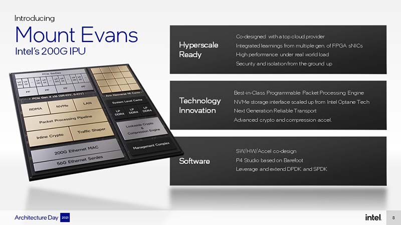 تم تصميم IPU لتمكين مقدمي الخدمات السحابية والاتصالات من تقليل النفقات العامة وتحرير الأداء لوحدات المعالجة المركزية. من بين أبنية IPU الجديدة: يعد Mount Evans أول معالج ASIC IPU من Intel، وقد تم تصميمه لمعالجة تعقيد مراكز البيانات المتنوعة والمشتتة. اما Oak Springs Canyon فهي منصة مرجعية IPU تم إنشاؤها باستخدام معالج Intel Xeon D و Intel Agilex FPGA. وقد تم تصميم منصة التطوير السريع Intel N6000 للاستخدام مع الخوادم المستندة إلى Xeon.