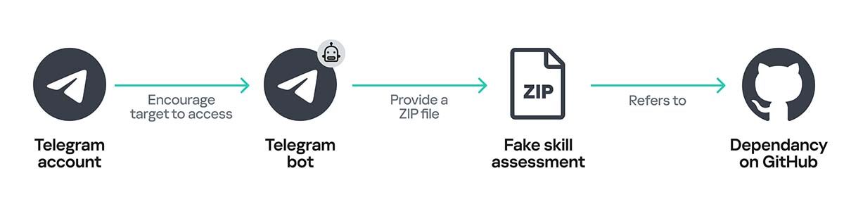 أما في حملة “GhostHire”، فتستهدف مجموعة التهديدات المتقدمة المستمرة مطوري تقنية سلسلة الكتل، وتوهمهم بأنها إحدى جهات التوظيف. ويخدع المجرمون الضحايا لتنزيل وتشغيل ملفٍ على GitHub يتضمن برمجيات خبيثة، وذلك بعدما أخبروهم بأنّ غايتهم تقييم مهاراتهم. وتشترك حملتا “GhostCall” و”GhostHire” في البنية التحتية والأدوات، لكنّ حملة “GhostHire” لا تعتمد على مكالمات الفيديو، بل تركز جهودها على التواصل مع المطورين والمهندسين الخبيرين عبر عروض توظيف وهمية. وبعدما يحدث الاتصال الأول مع الضحايا، يضيفهم المجرمون إلى بوت تيليجرام يرسل إما ملف ZIP أو رابط GitHub، ويمهلهم مهلة قصيرة لإتمام الأمر. وحالما ينهون ذلك، تثبت البرمجية الخبيثة نفسها في جهاز الضحية بعد أن تعدل خصيصاً لتناسب نظام التشغيل.