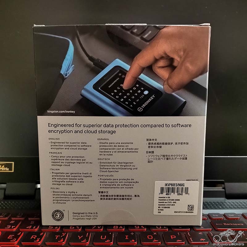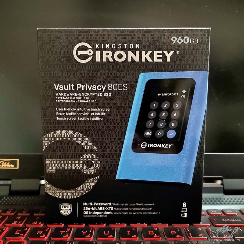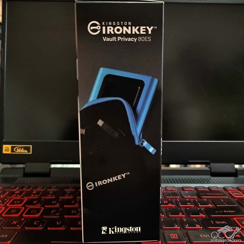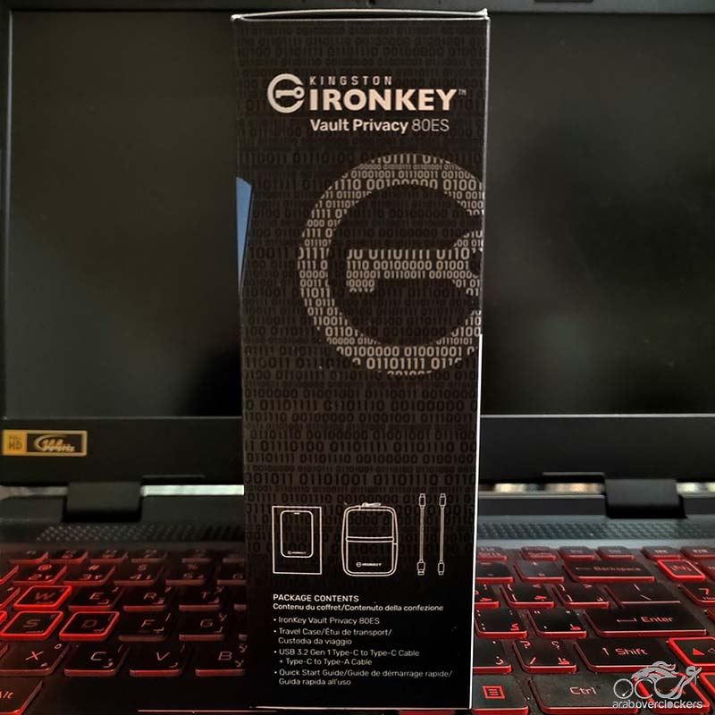 يأتي IronKey Vault Privacy 80 داخل صندوق اسود متوسط الحجم يحمل اسم المنتج في المقدمة جنبًا إلى جنب مع شهادة FIPS 197 وتشفير XTS-AES 256-bit مع ذكر انه يدعم كلمات سر مختلفة، ويمكن رؤية صورة المنتج من الامام تظهر الشاشة المدمجة.