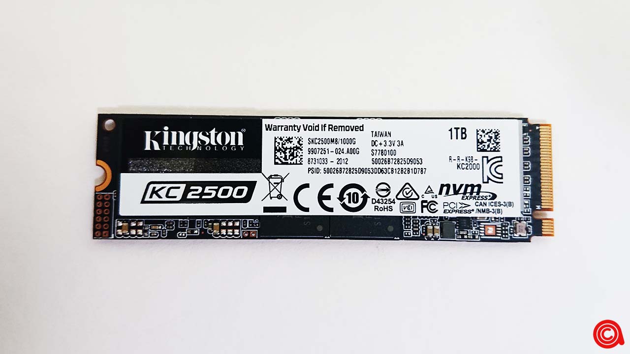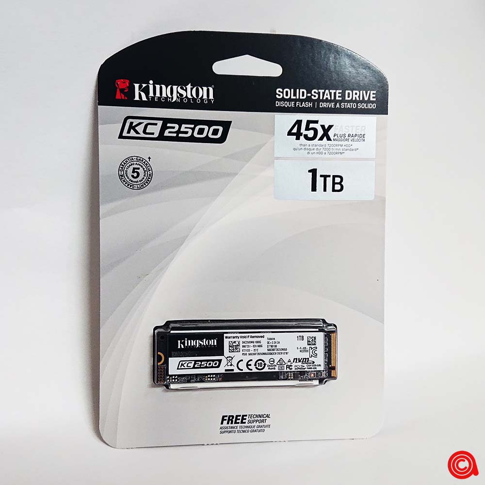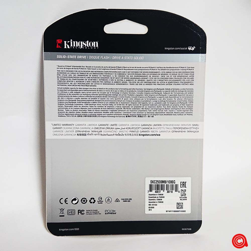 يصل Kingston KC2500 في غلاف من الورق المقوى غير القابل لإعادة الاستخدام مع وجود نافذة بلاستيكية مثبتة على ال SSD. والعبوة متينة للغاية للحفاظ على قرص NVMe في مكانه.