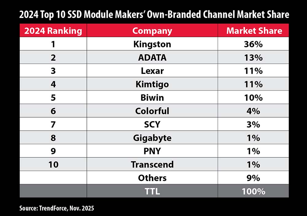 أعلنت شركة كينجستون ديجيتال عن تصدّرها قطاع أقراص الحالة الصلبة (SSD) العالمية لعام 2024؛ وذلك بعدما تم اختيارها من قبل TrendForce كأكبر مورّد خارجي لأقراص الحالة الصلبة خلال العام. وبحسب أحدث بيانات ترندفورس، حققت كينجستون حصة سوقية استثنائية بلغت 36% من إجمالي الوحدات التي تم شحنها عالميًا في 2024.