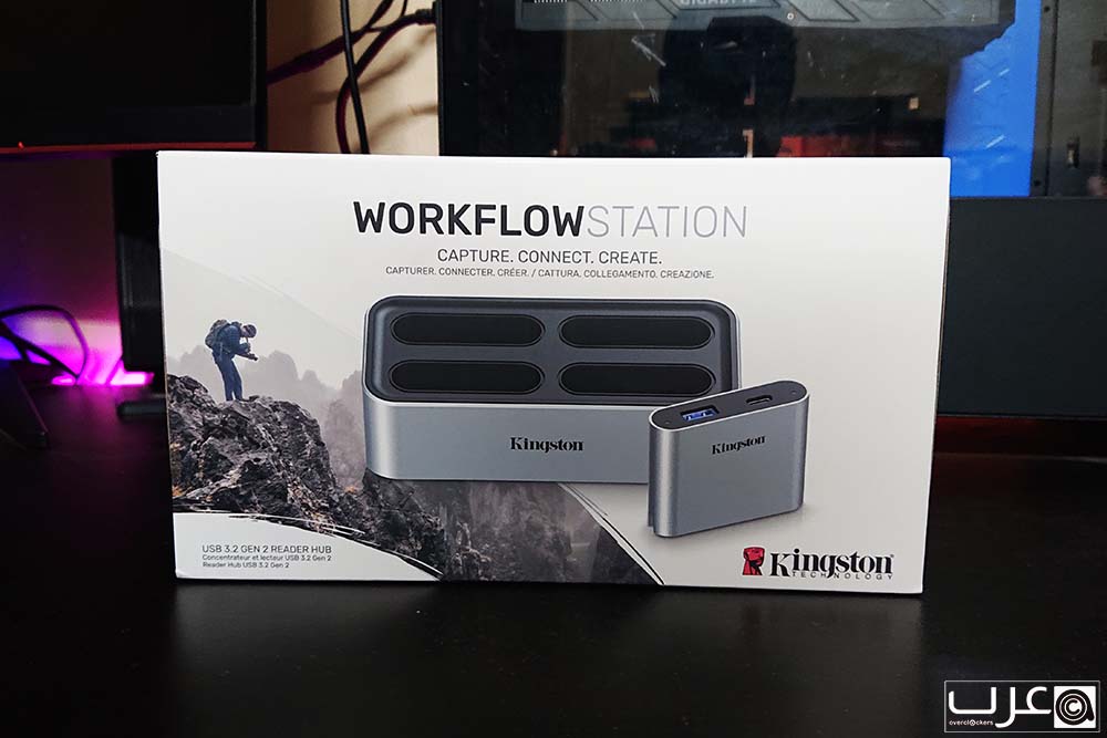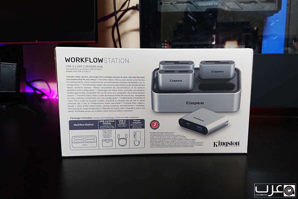 يتم شحن Kingston Workflow Station في عبوة فخمة كبيرة الحجم، تعطى انطباعا مسبقا عما سيتواجد في داخلها. تحتوي على صورة المنتج من الامام/ ومن الخلف المواصفات ومحتويات العبوة وهي
