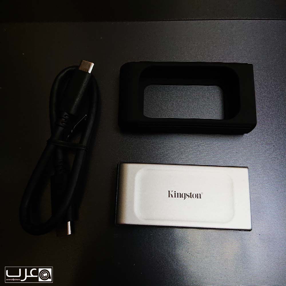 بعد اخراج Kingston XS2000 من العبوة نجد انه داخل تغليف شفاف كامل لكي يحافظ عليه من الصدمات اثناء النقل والعرض، فهو ليس وحدة رخيصة. وتشمل العبوة القرص نفسه، وكابل USB-C الى USB-C بالاضافة الى غلاف مطاطي للحماية من الصدمات.