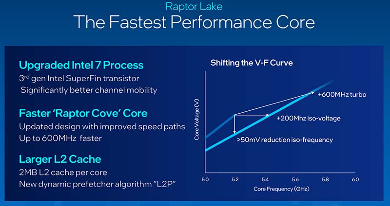 وقد أتاح ضبط منحنى تردد الجهد (VF) لشركة إنتل أن تضغط للحصول المزيد من المكاسب من ناحية التردد مقابل الجهد. فقد تمنكت إنتل من زيادة ذروة تردد انوية الاداء P بمقدار كبير مع Raptor Lake، حتى 1 جيجاهرتز في بعض الحالات. مثال على ذلك معالج Core i9-13900K الذي يحتوي على أقصى تردد توربو يصل إلى 5.8 جيجاهرتز؛ هذا يعادل ما يزيد قليلاً عن نسبة 11.5٪ فوق Core i9-12900K. ووفقًا لتحسينات منحنى V / F الذي تم إصداره، تمكنت إنتل من الحصول على 200 ميجاهرتز عند ISO-Voltage، مع تقليل 50 مللي فولت عند تردد ISO.