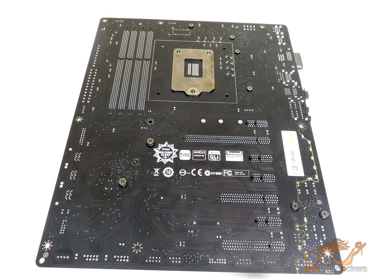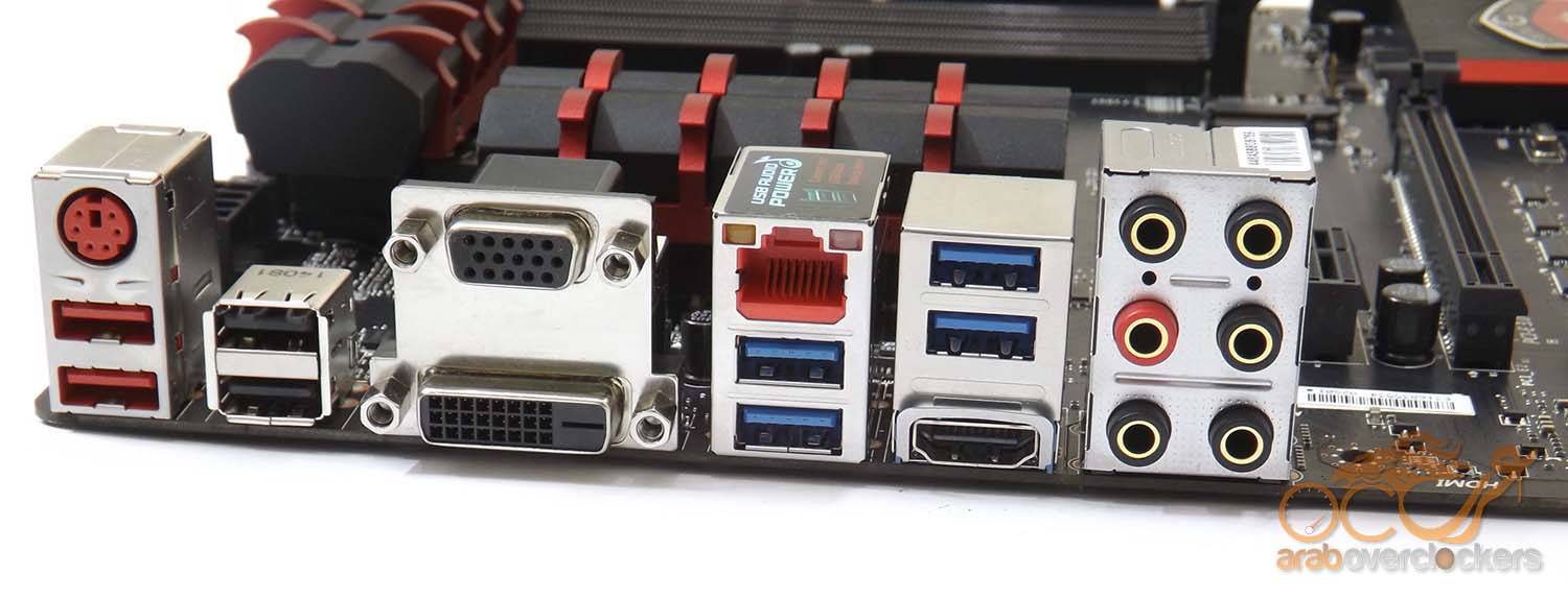 اما الجهة الخلفية للوحة فتحمل العديد من المنافذ المعتادة، فهناك منافذ DVI و HDMI و VGA للتوصيل الى اجهزة العرض، ومنفذ وحيد للشبكة من نوع Killer NIC، ولم تبخل MSI في تزويد لوحتها بمنافذ USB بأربعة منافذ USB 3.0 (باللون الازرق) ومنفذا USB 2.0 (باللون الاسود) ومنفذا USB 2.0 عالي السرعة والاستجابة (باللون الاحمر) للاستخدام مع ملحقات الالعاب الاحترافية كلوحة الكتابة والفأرة، بالاضافة الى منفذ PS2.