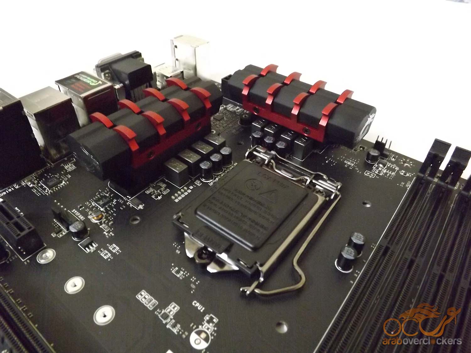 الجزء الامامي “حول المقبس” مفتوح مع وجود مشتتين باللون الاسود والاحمر على شرائح ال VRM، تصميم هذه المشتتات يشبه مخالب التنين وهو ما استوحت منه MSI الكثير عند تصميم هذه السلسلة واغلب منتجاتها، فشعار Red Dragon اي التنين الاحمر هو الشئ المميز والمشترك بين جميع اجهزة وملحقات MSI الخاصة لمحبي الالعاب.