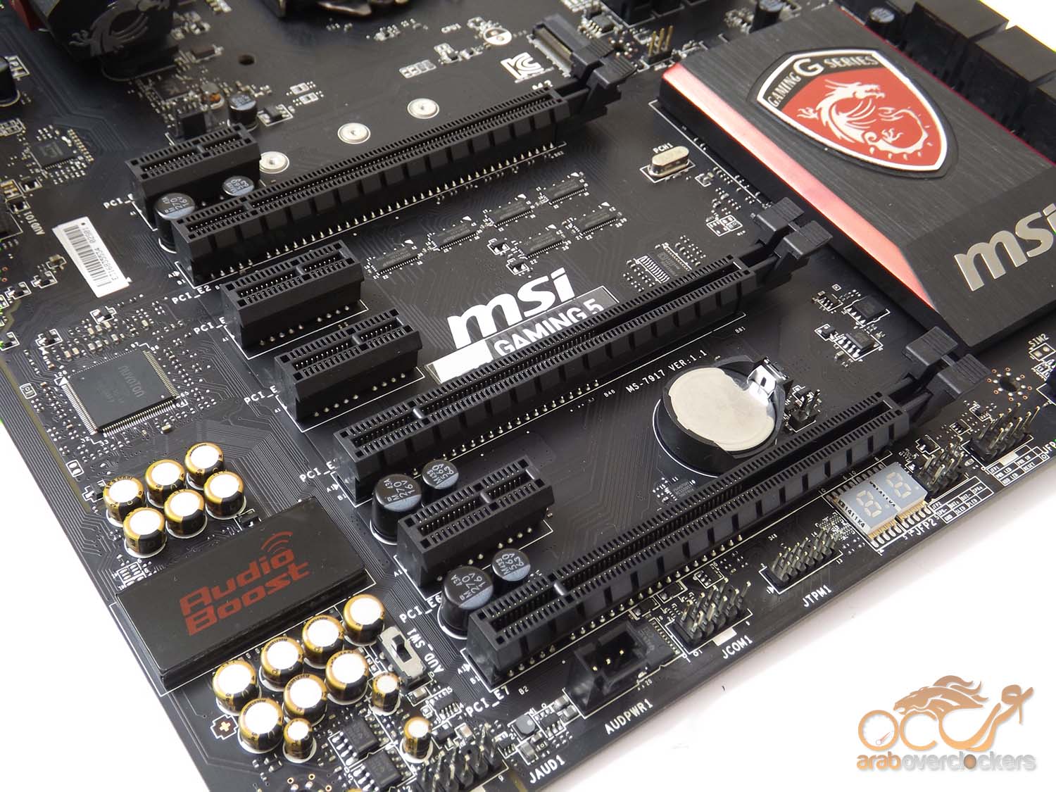 تأتينا لوحة MSI GAMING 5 بفتحات “شقوق” التوسعة الاساسية، وهي 3 فتحات PCIe 3.0 x16 واربعة فتحات PCIe 2.0 x1، كما تحتوي على اربعة فتحات للذواكر من نوع DIMM ثنائية القنوات “Dual Channel” وهي قادرة على دعم ذواكر بسرعة 3200 ميجاهرتز واعلى.