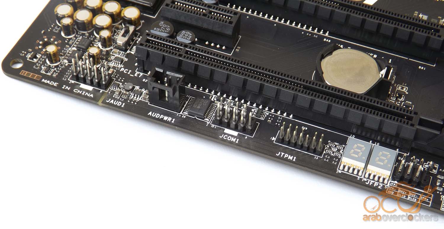 وفي الجزء السفلي من اللوحة نجد مقابس التوصيل المعتادة كفتحات توصيل ال USB والصوت، بالاضافة الى مقبس جديد لتوصيل كابل امداد الطاقة للبطاقة الصوتية بتقنية Audio Boost، كما نجد فتحات توصيل اللوحة بالصندوق “الكيسة” بالاضافة الى وجود 5 منافذ على اللوجة لتوصيل المرواح وتدعم هذه المنافذ تقنية PWM وتتيح لك اللحو التحكم فيها من خلال ال BIOS او من خلال نظام التشغيل عبر برنامج مرفق مع اللوحة.