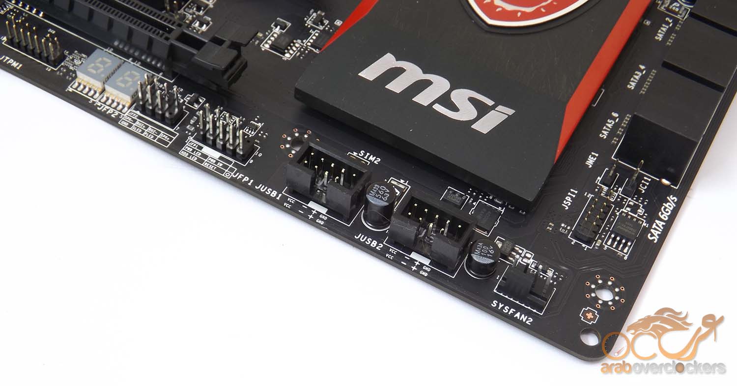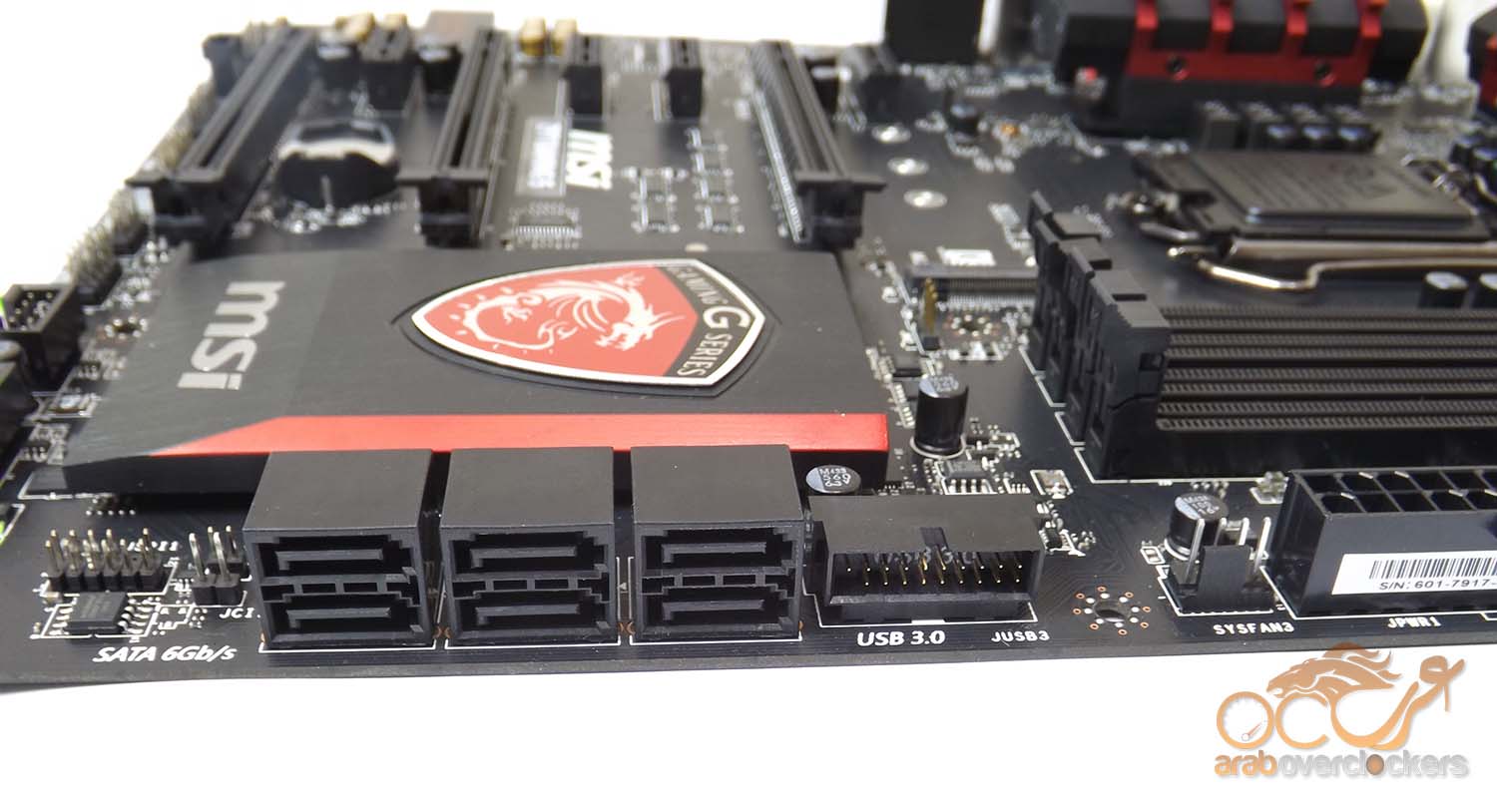 وكما نرى تحمل لوحة MSI GAMING 5 عدد 6 منافذ SATA 6 Gb/s بالاضافة الى منفذ USB 3.0 للتوصيل الى لوحة الصندوق “الكيسة” الامامية.