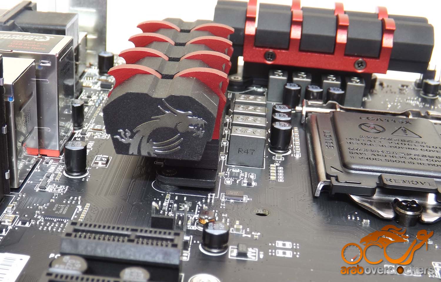 كنا قد تحدثنا في بداية عرضنا للوحة عن التصميم الجديد والذي حرصت MSI على اظهاره بشكل جيد في لوحتها GAMING 5 جنبا الى جنب مع باقي التغييرات الاخرى، فكما سبق ان ذكرت استوحت الشركة تصميم مشتتات ال VRM من مخالب التنين وحي كما نرى في الصورة تبرز باللون الاحمر على باقي المشتت الذي يأتينا باللون الاسود في تناغم جميل، وفي نهاية كل مشتت تطل علينا رأس التنين باللون الفضي، وهو امر محبب خصوصا اذا كنت ممن يقومون بتعديل صناديق الحاسب، فسوف يضفي الشكل العام للوحة منظرا مبهرا الى الجهاز داخل الصندوق.