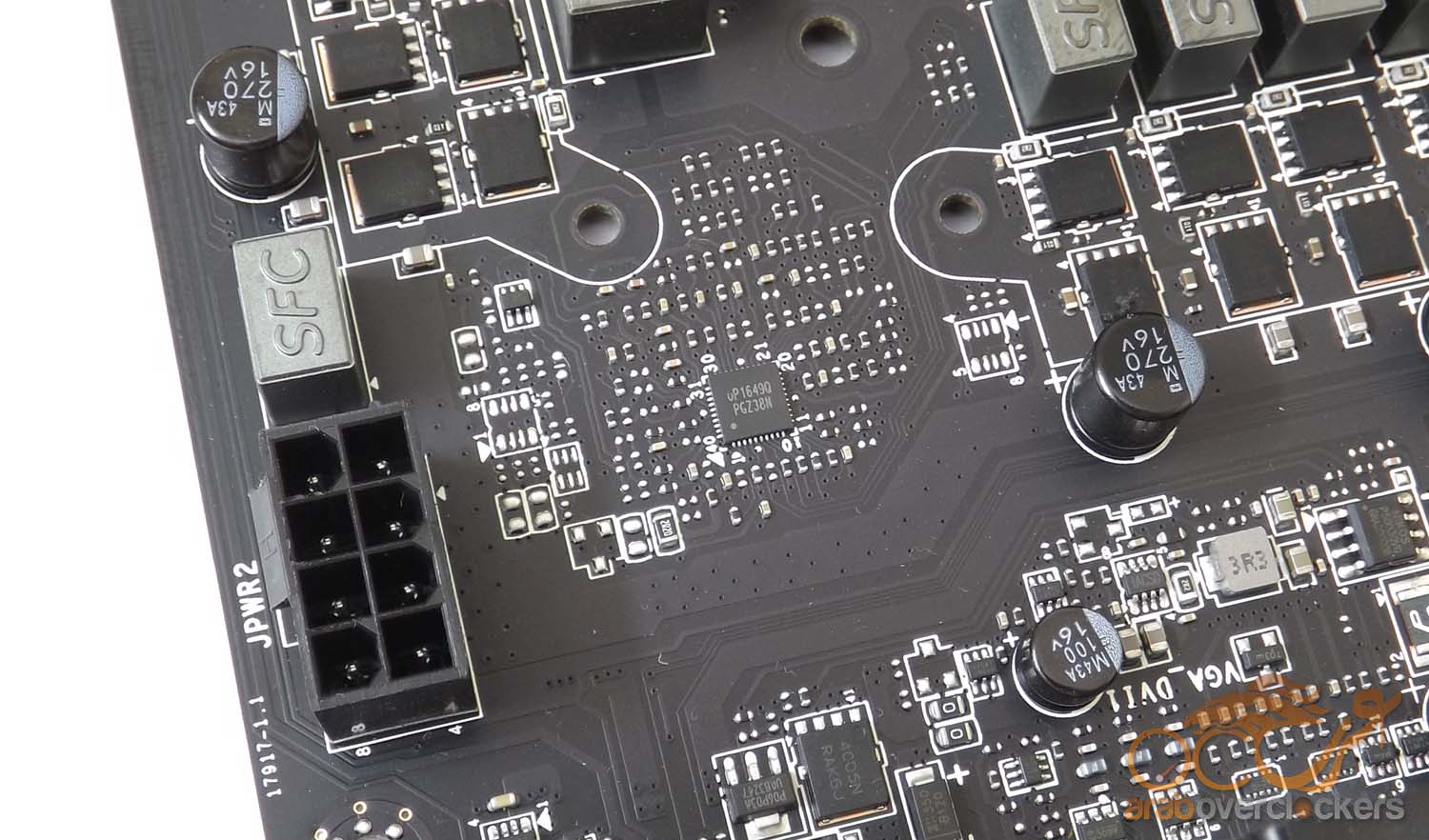 وبين مشتتات ال VRM نجد المتحكم الخاص بها وهو نوع من اشباه الموصلات “UPI Semiconductor” يقوم بالتحكم في دائرة الطاقة “phase” الخاصة بال VRM وفي لوحتنا هذه نجد تصميم 8-phase الذي يعتبر كافي جدا حتى لعمليات كسر السرعة.