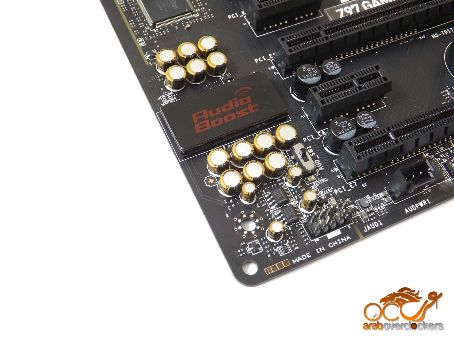 ها اقد اتينا لبطاقة الصوت المدمجة اخيرا، لا اريد التحدث عن العديد من التفاصيل (سأتركها للمراجعة الكاملة)، تأتي بطاقة الصوت بتقنية “Audio Boost” التي تعمل على تحسين وتضخيم الصوت وكما ذكرت من قبل فأننا نستطيع امداد هذه البطاقة بالطاقة الازمة من خلال الكابل المخصص لذلك حتى نحصل على افضل اداء ممكن خصوصا مع سماعات الرأس الاحترافية، ويتم تشغيل خاصية الامداد بالطاقة من خلال زر يتواجد بجانب المكثفات (كما يظهر بالصورة).