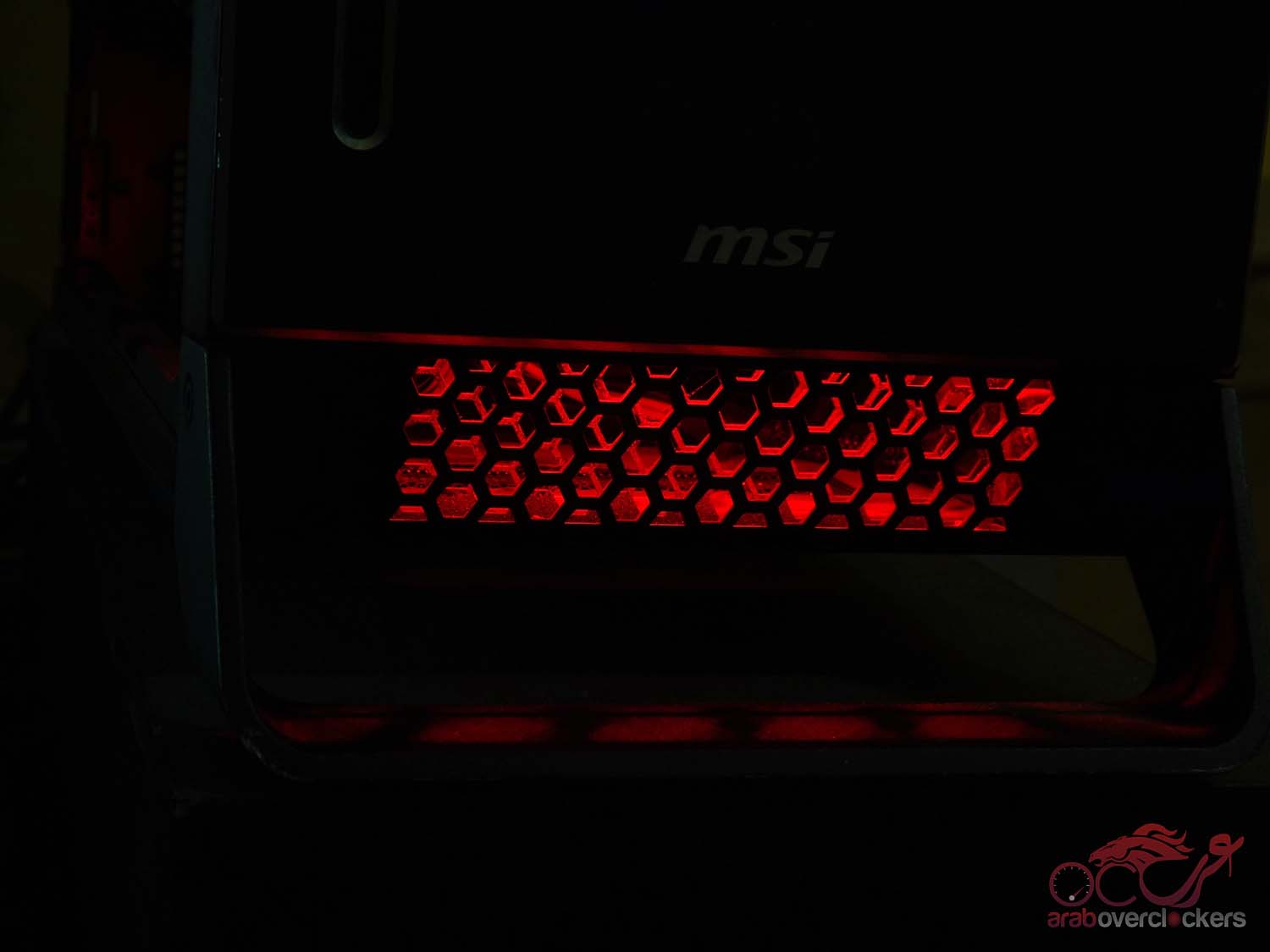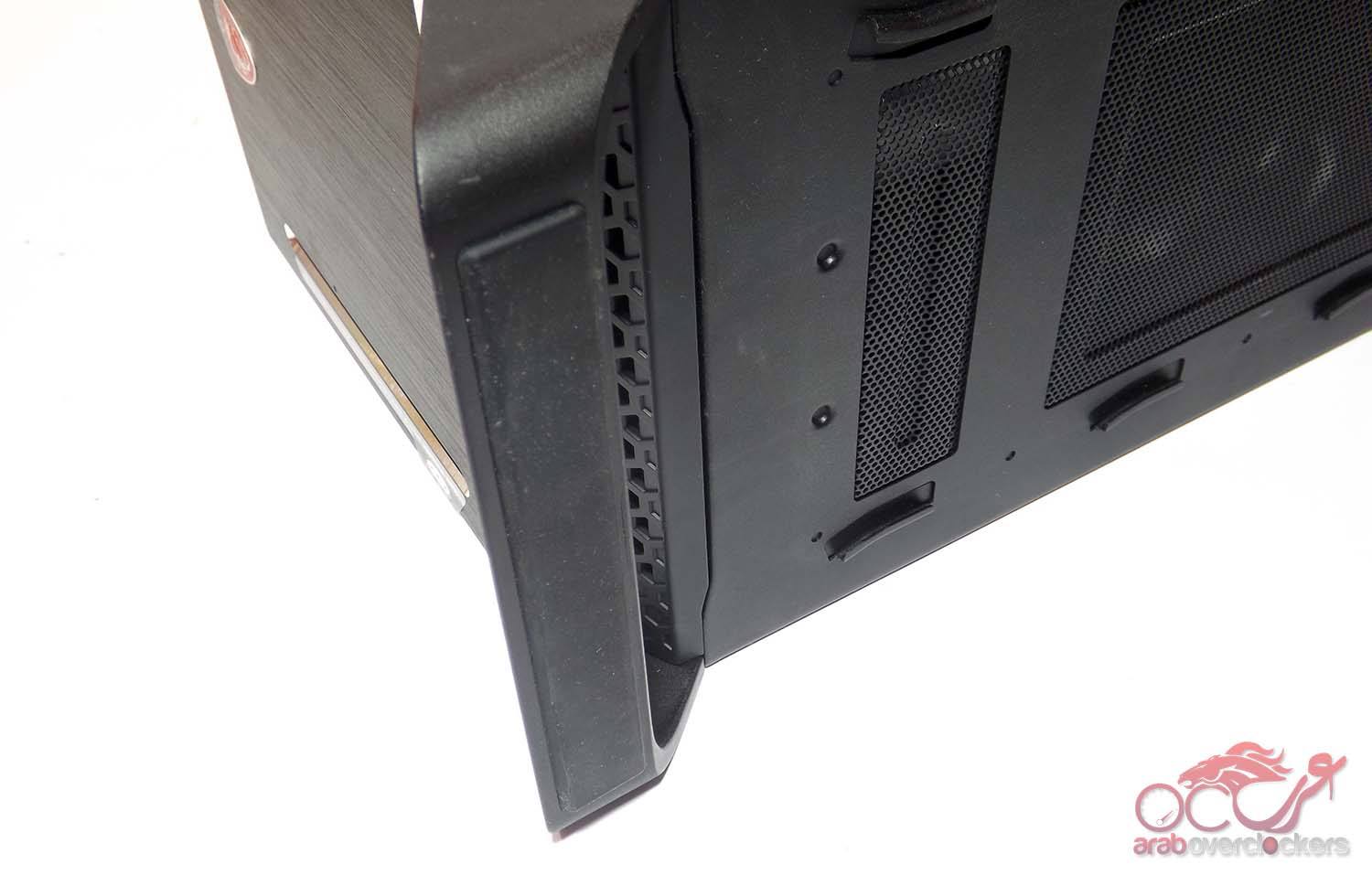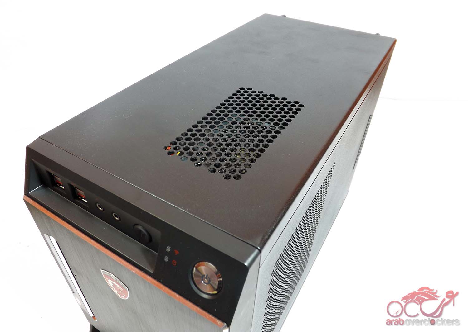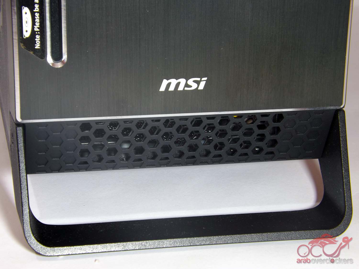 الصندوق من الجانب بعد نزع الغطاء نجد مزود الطاقة كما سبق وشرحنا وقد وجهت مروحته للجانب كي تأخذ الهواء وتضخه داخل المزود ومنه للصندوق, كما قامت MSI بتثبيت فلتر مضاد للأتربه كي يمنع مرور الأتربه لداخل المزود أو الصندوق.