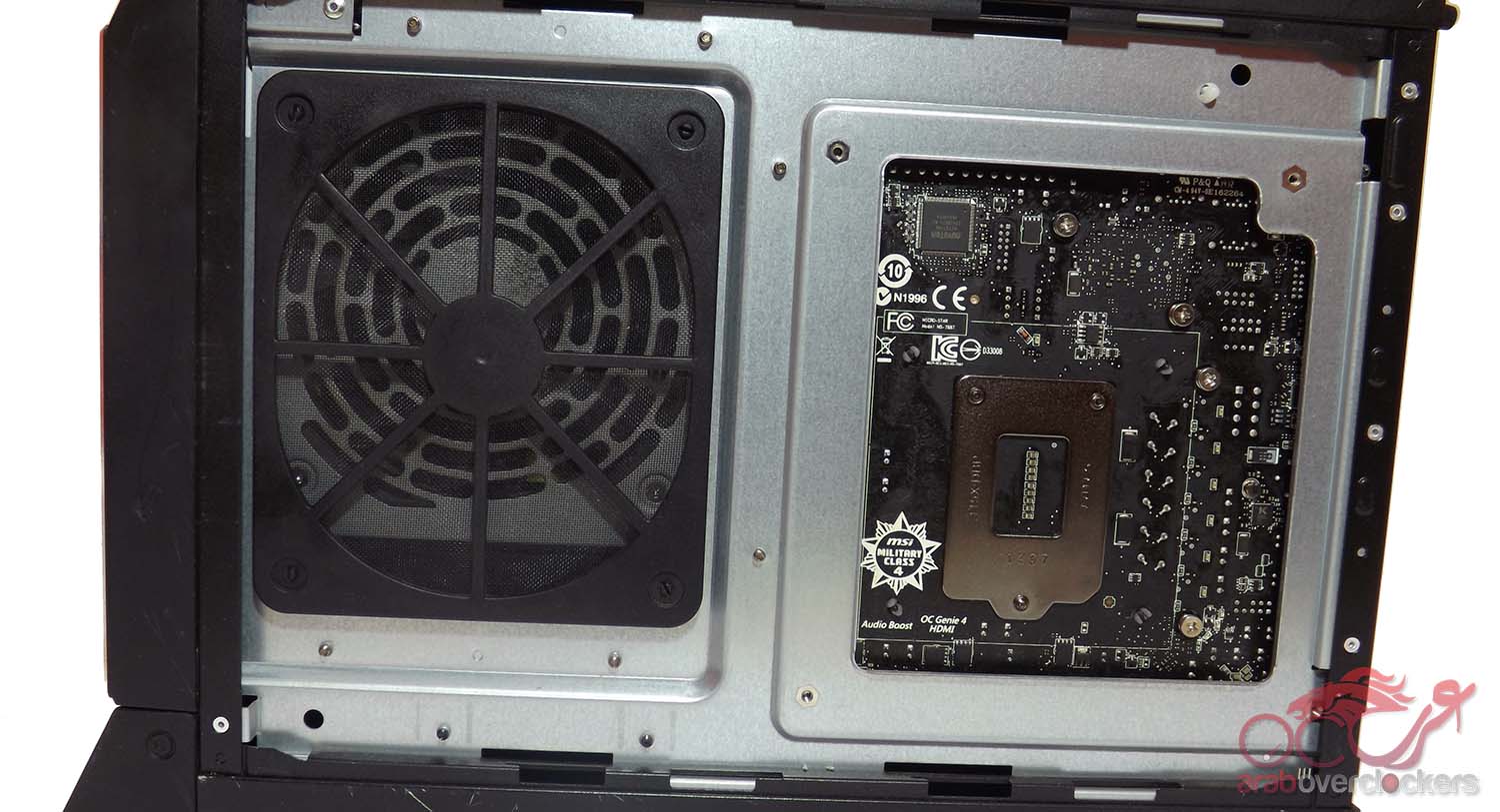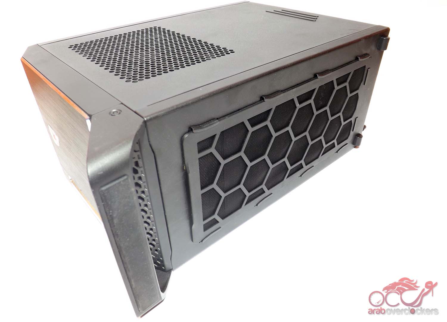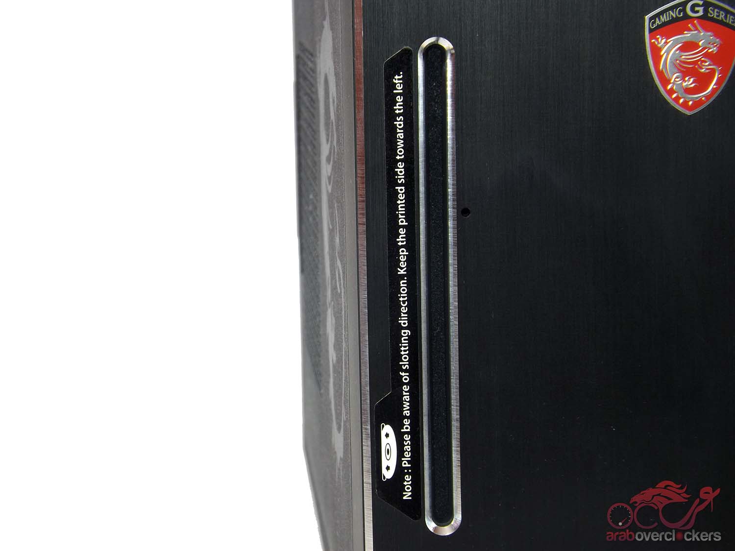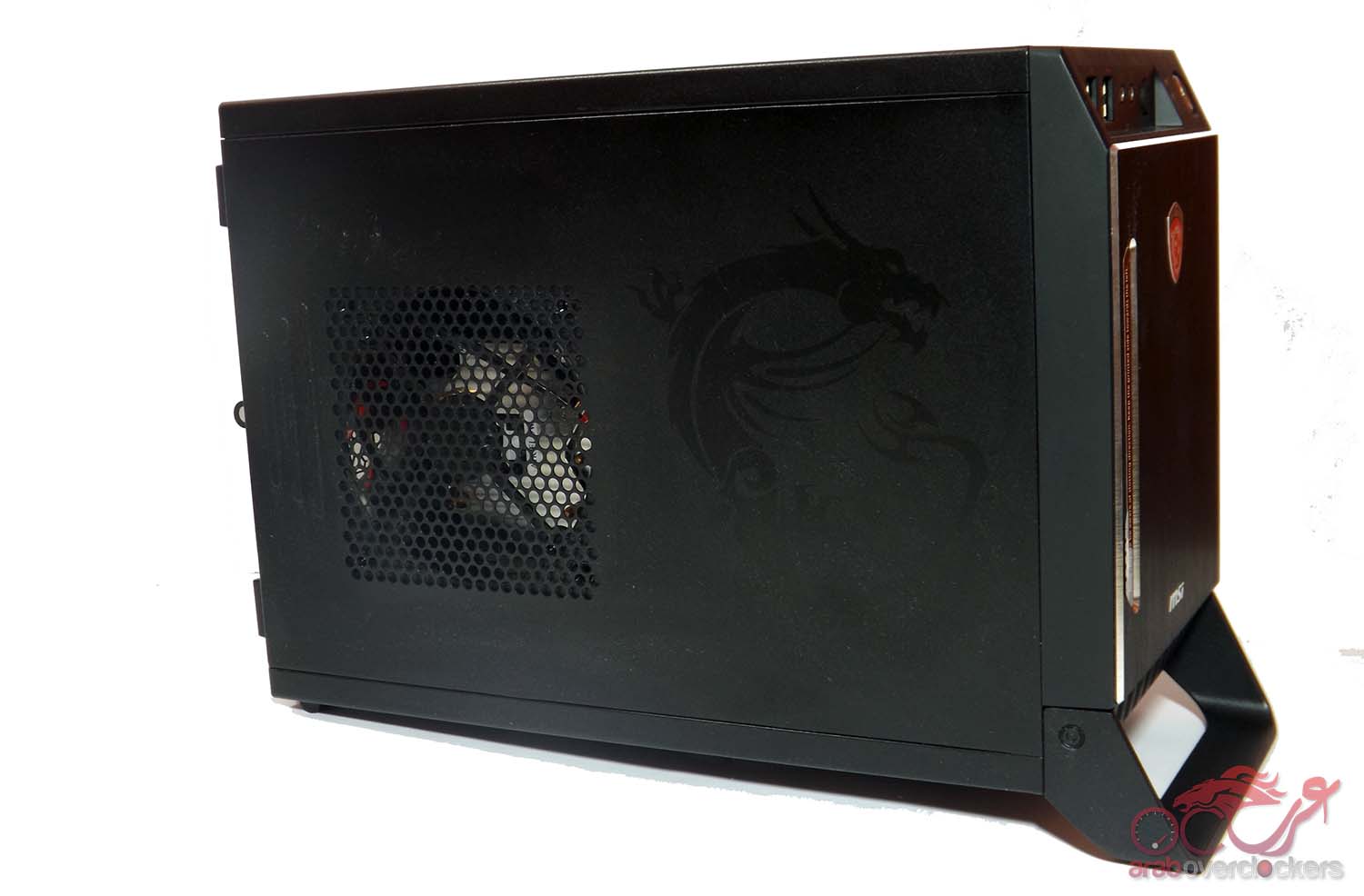 الصندوق من الجانب بعد نزع الغطاء نجد مزود الطاقة كما سبق وشرحنا وقد وجهت مروحته للجانب كي تأخذ الهواء وتضخه داخل المزود ومنه للصندوق, كما قامت MSI بتثبيت فلتر مضاد للأتربه كي يمنع مرور الأتربه لداخل المزود أو الصندوق.