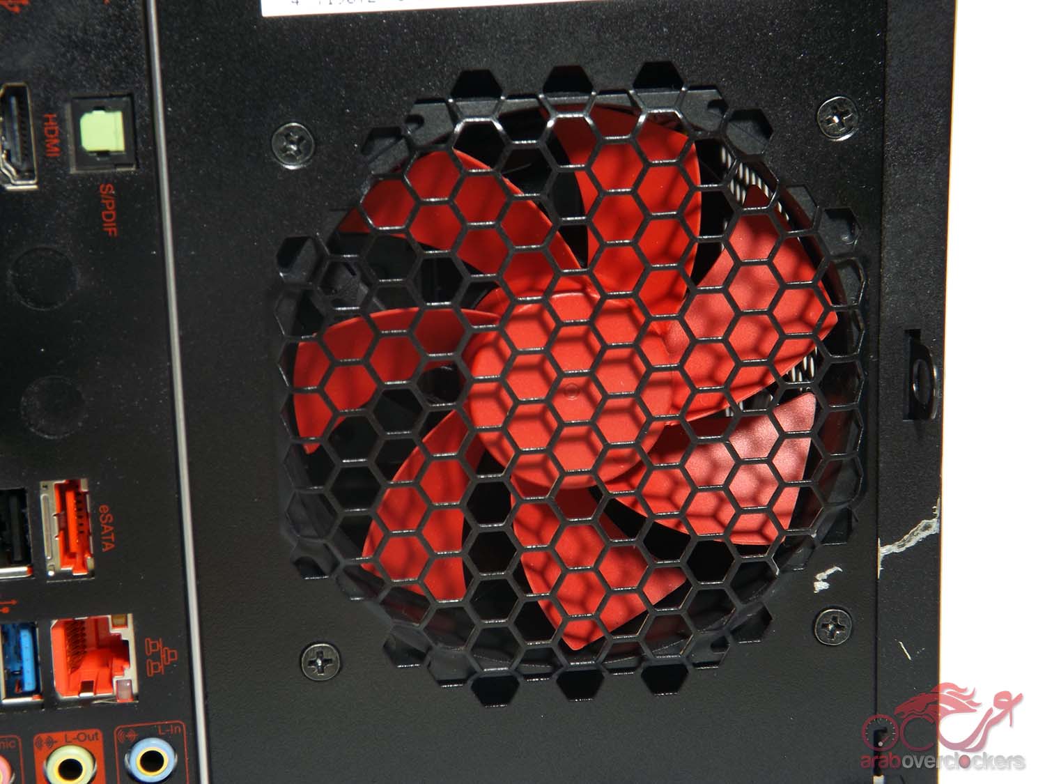 المروحة بالخلف بقياس 92مم ويمكنها الدوران بسرعة 3600دورة بالدقيقة وهو شئ للأسف مزعج حين تدور بكامل سرعتها ما اضطرني لفصلها. لكن بعد استخدام برنامج DRAGON FAN Control Application اعدت تشغيلها وكان الأمر اقل إزعاجاً بكثير.