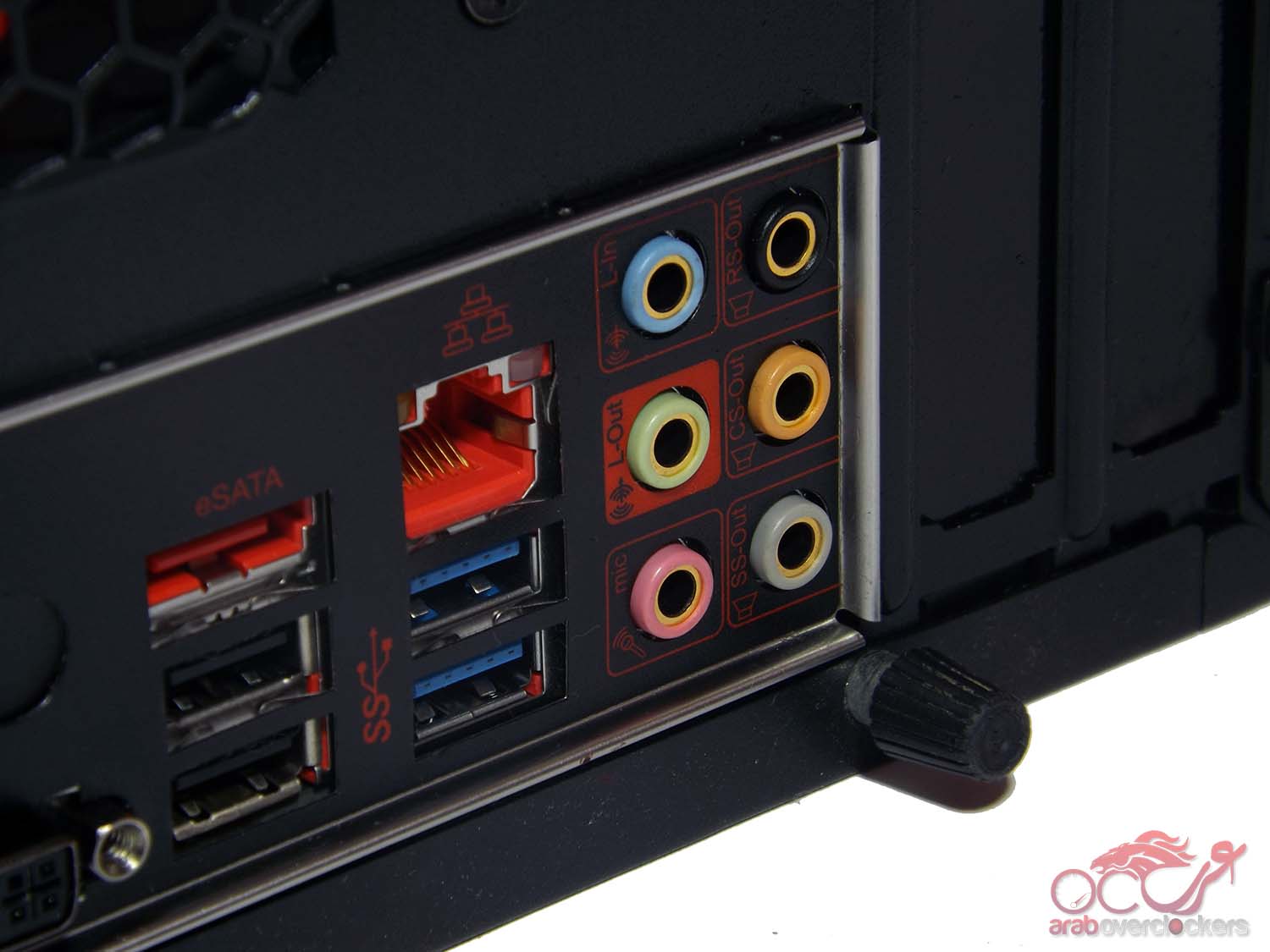 وبالأضافة للمنفذين السابق ذكرهم نجد منفذين USB2.0 اخرين كذلك منفذ eSATA 3Gb/s وبعد ذلك منفذين أخرين USB3.0 ومنفذ التوصيل الشبكي LAN RJ45 المدعوم من قبل شريحة E2205 Gigabit LAN من عائلة Killer.