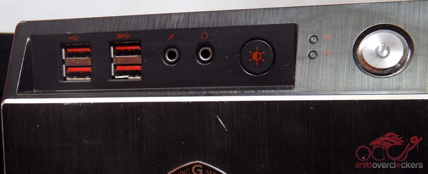 لوحة التحكم الأمامية تحور زر التشغيل فضي كبير الحجم كذلك زر الأضائه الخاص بالصندوق وسنتعرف علي مكان الأضائه لاحقاً كما يوجد منفذين أماميين للصوت والميكروفون.