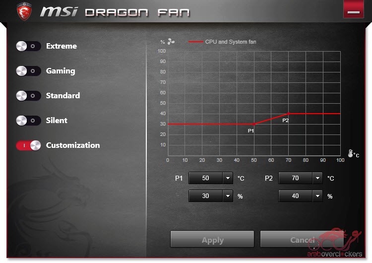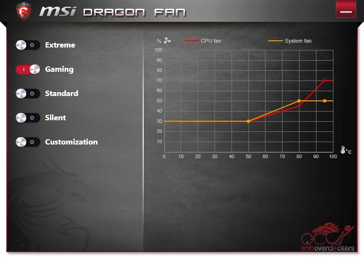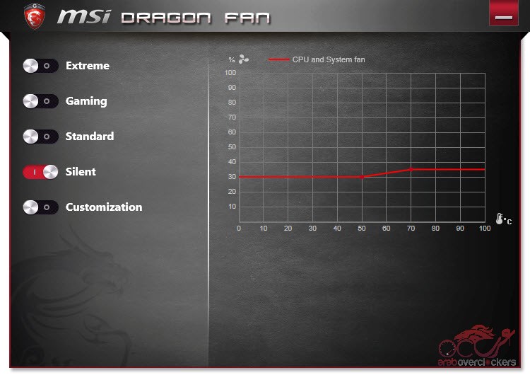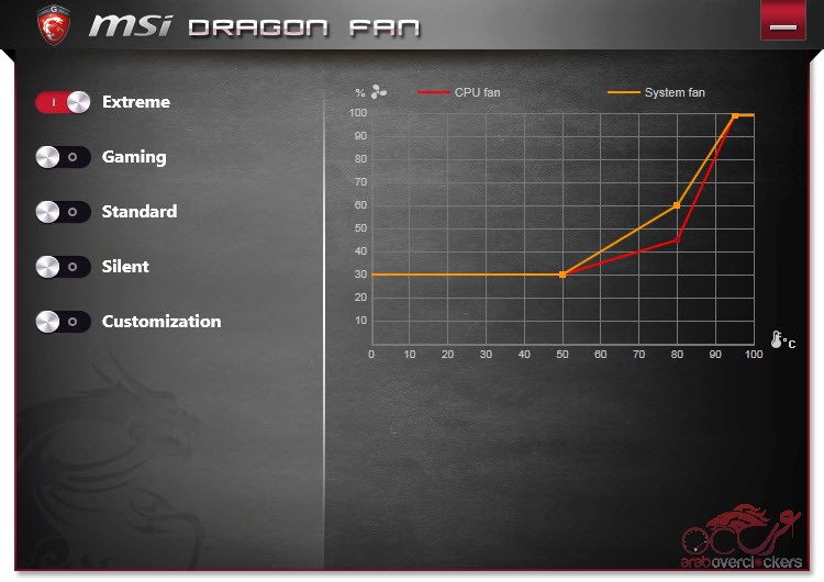 البرنامج يتيح لك التحكم في المراوح سواء الDragon Fan او مروحة المعالج من خلال اعدادات محدده مسبقاً وهي Extreme , Gaming , Standard , Silent و الخيار الأخير Customization الذي يمكنك من وضع إعداداتك الخاصة.