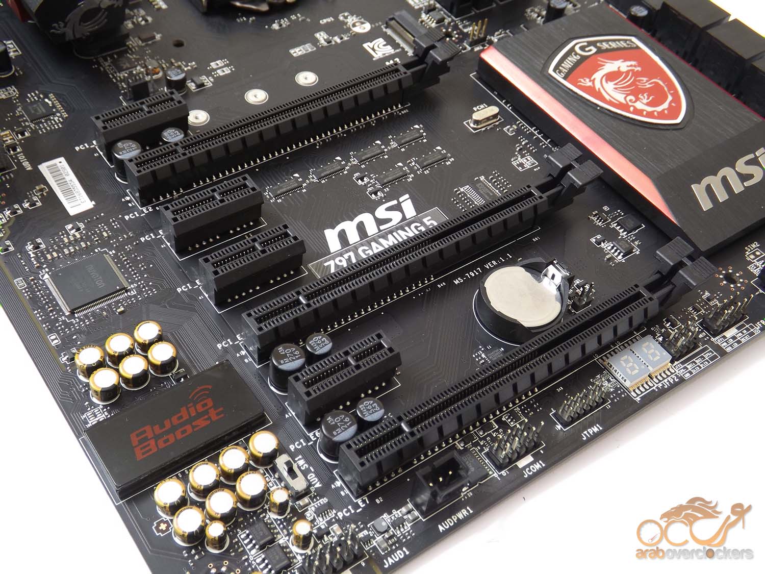 تأتينا لوحة MSI GAMING 5 بفتحات “شقوق” التوسعة الاساسية، وهي 3 فتحات PCIe 3.0 x16 واربعة فتحات PCIe 2.0 x1، كما تحتوي على اربعة فتحات للذواكر من نوع DIMM ثنائية القنوات “Dual Channel” وهي قادرة على دعم ذواكر بسرعة 3200 ميجاهرتز واعلى.