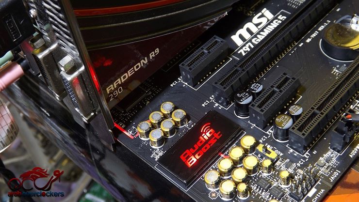 ها اقد اتينا لبطاقة الصوت المدمجة اخيرا، تأتي بطاقة الصوت بتقنية “Audio Boost” التي تعمل على تحسين وتضخيم الصوت وكما ذكرت من قبل فأننا نستطيع امداد هذه البطاقة بالطاقة الازمة من خلال الكابل المخصص لذلك حتى نحصل على افضل اداء ممكن خصوصا مع سماعات الرأس الاحترافية، ويتم تشغيل خاصية الامداد بالطاقة من خلال زر يتواجد بجانب المكثفات (كما يظهر بالصورة).