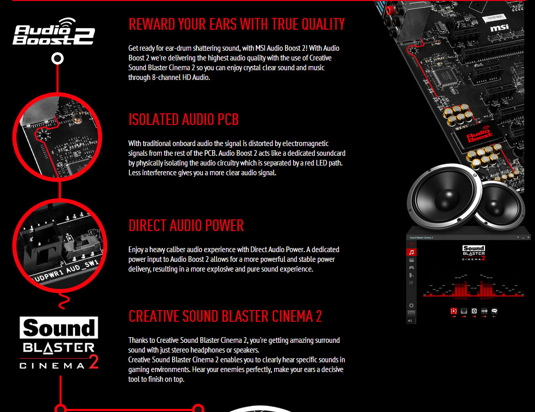 Audio Boost هو الأسم الذي تك إطلاقة علي البطاقة الصوتيه المدمجة والتي تأتي مضيئة باللون الأحمر وبدرع حماية من EMI أو التداخلات الكهرومغناطيسية التي قد تؤثر علي الأداء.