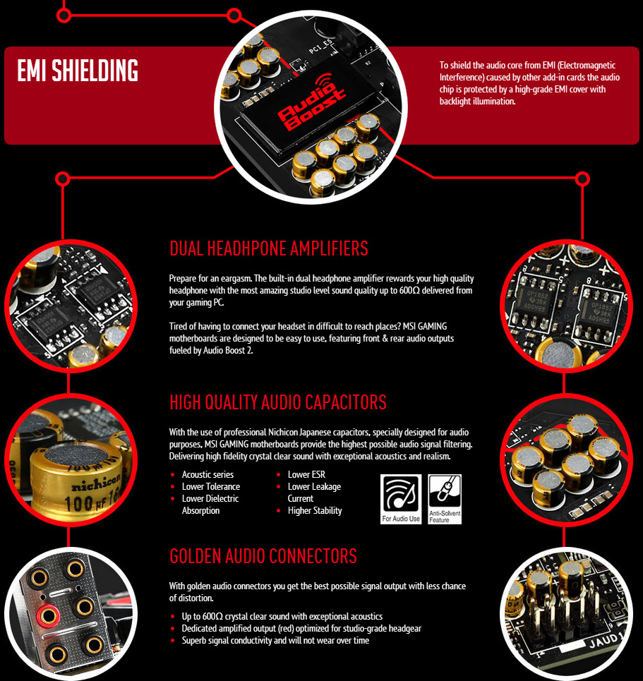 اللاعبين بالطبع يستخدمون في أغلبهم سماعات الرأس وهنا نجد اهتمام MSI بالأمر فأضافت مضخمي صوت Amplifiers خاصة لمساعات الرأس بقدرة علي توصيل صوت بكفائة عليه تصل إلي 600أوم.